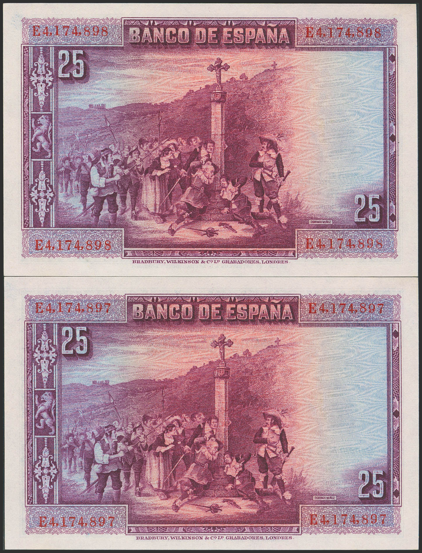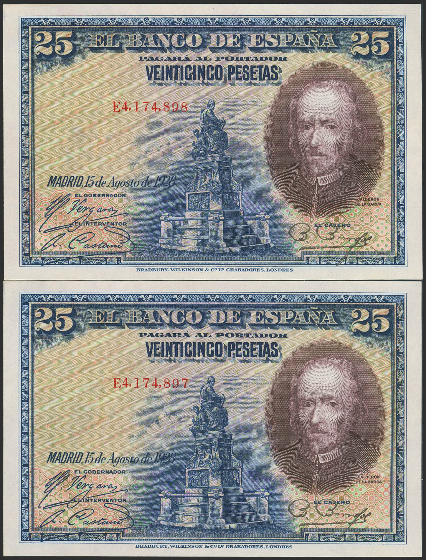 25 Pesetas. 15 de Agosto de 1928. Pareja correlativa. Serie E. (Edifil 2023: 353). Apresto original. SC.