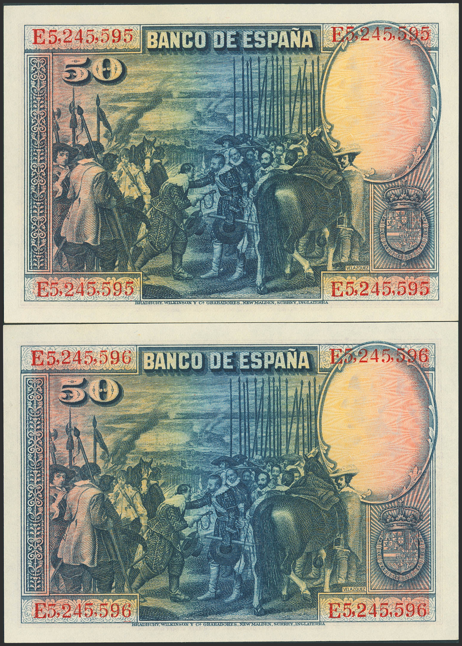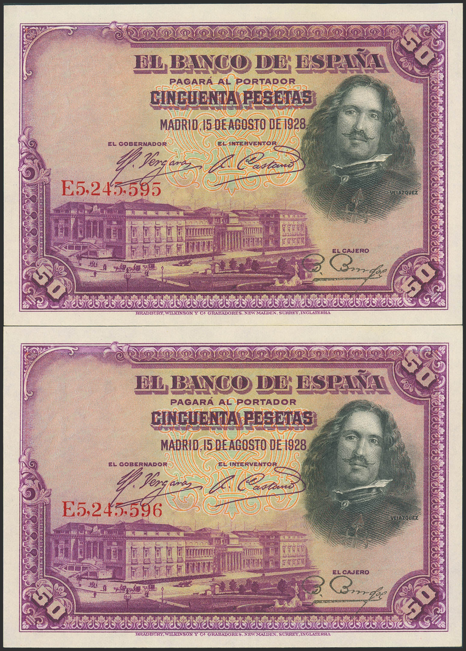 50 Pesetas. 15 de Agosto de 1928. Pareja correlativa. Serie E. (Edifil 2023: 354). Conserva todo su apresto original. SC--.