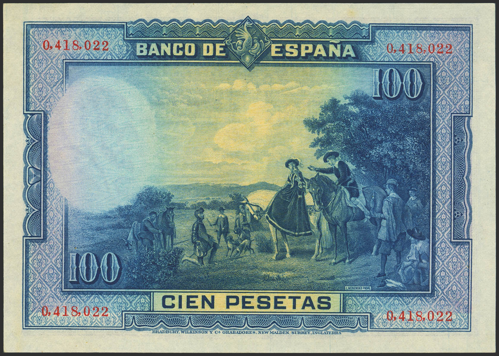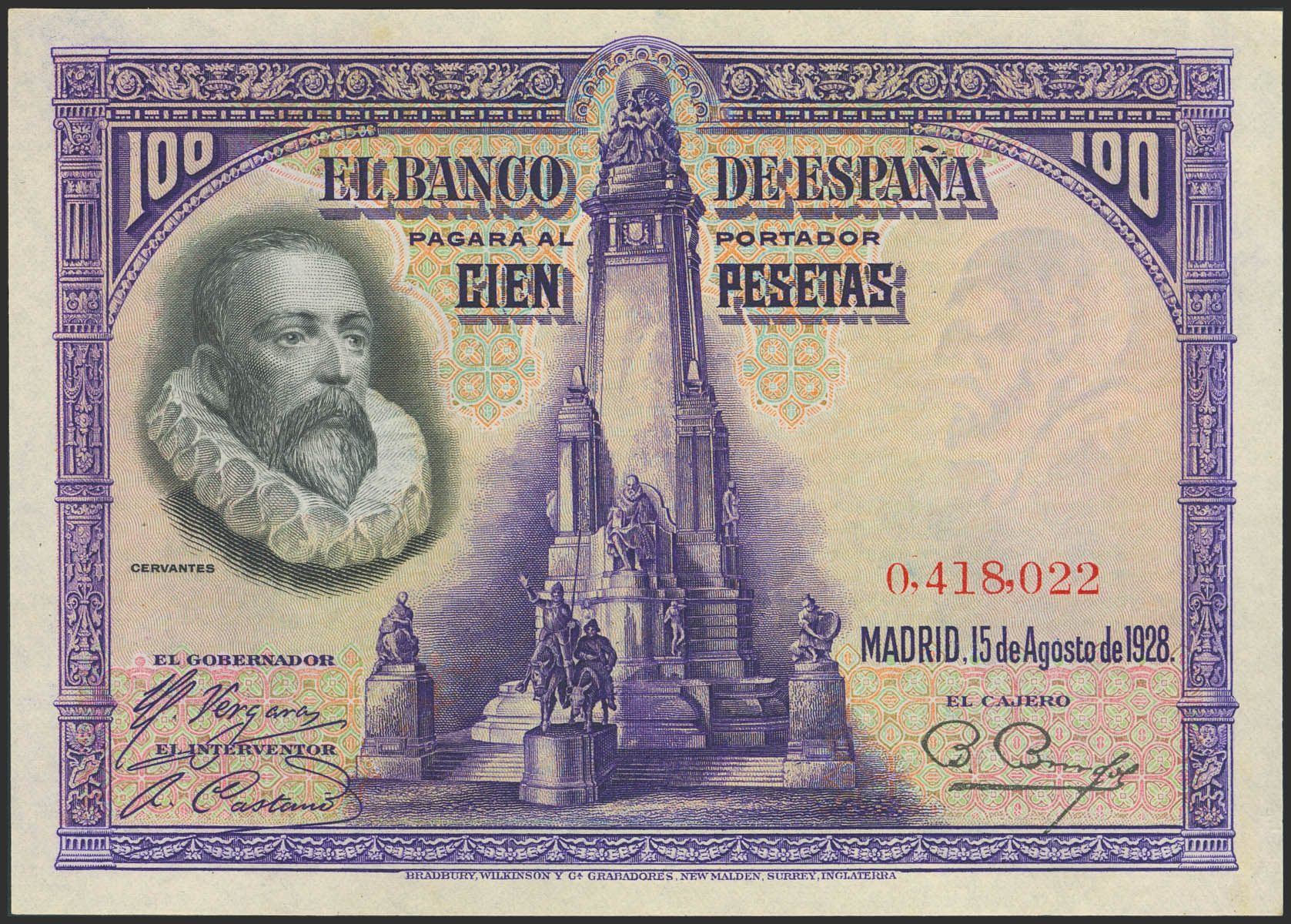 100 Pesetas. 15 de Agosto de 1928. Sin serie. (Edifil 2023: 355). Apresto original. EBC+++.