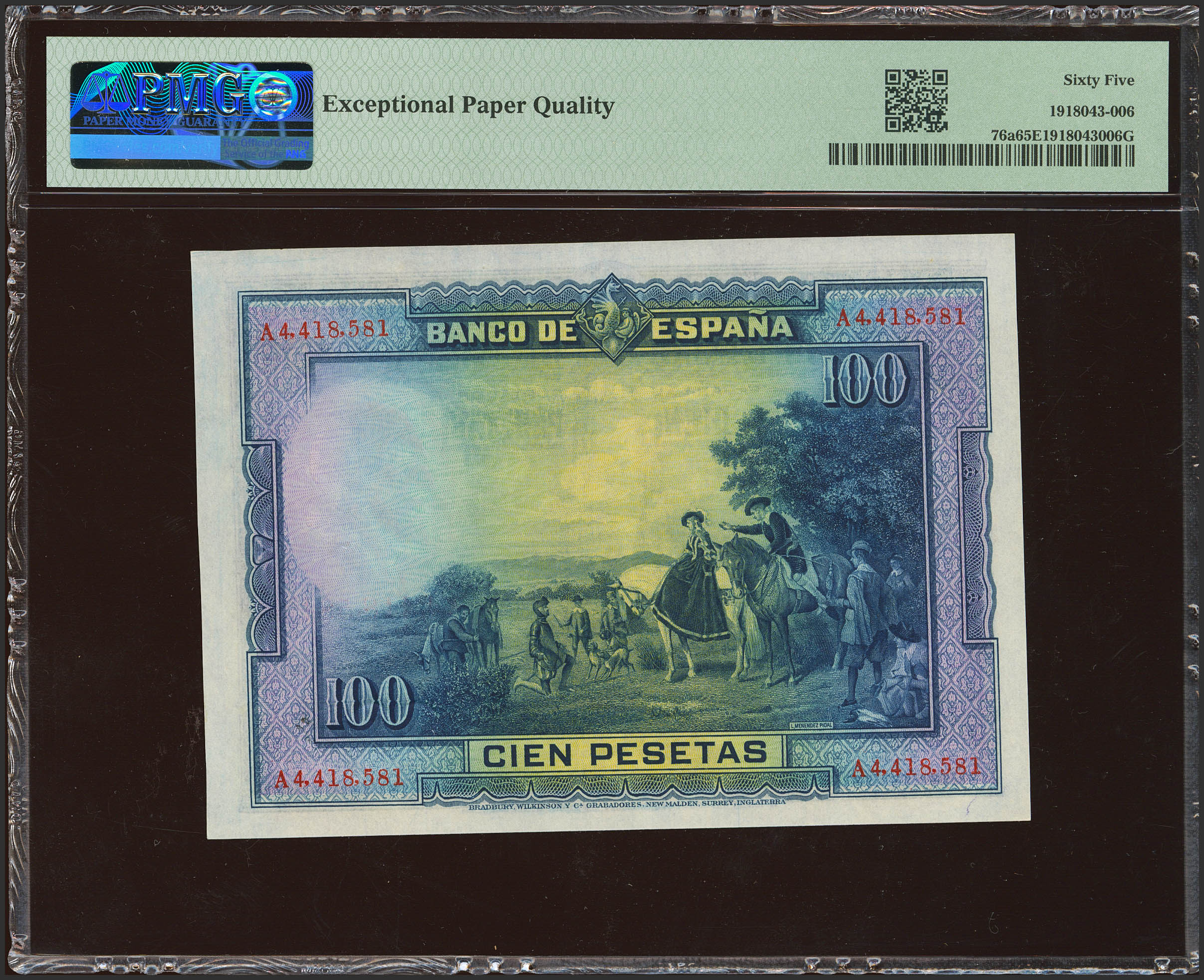 100 Pesetas. 15 de Agosto de 1928. Serie A. (Edifil 2023: 355a, Pick: 76a). Raro en esta excepcional calidad, apresto original. SC. Encapsulado PMG65EPQ.