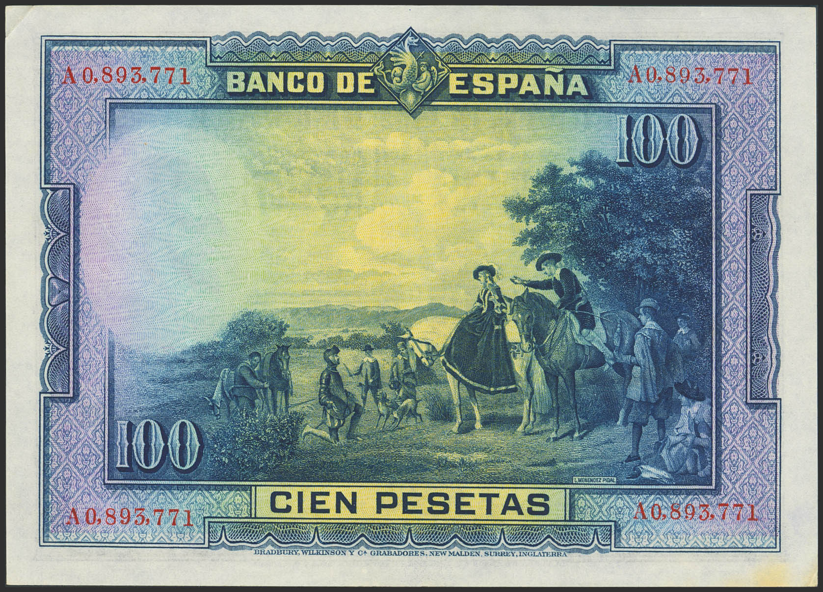 100 Pesetas. 15 de Agosto de 1928. Serie A. (Edifil 2023: 355a). Conserva todo su apresto original, manchita del tiempo. SC--.