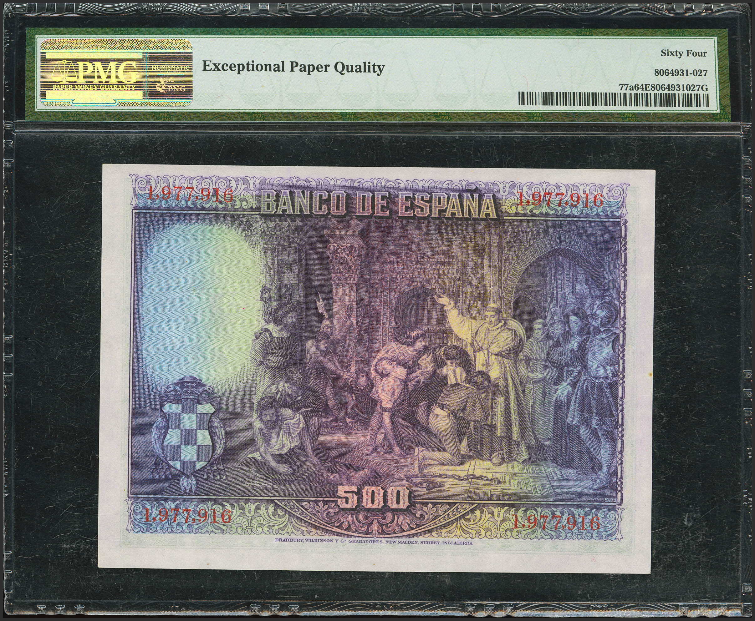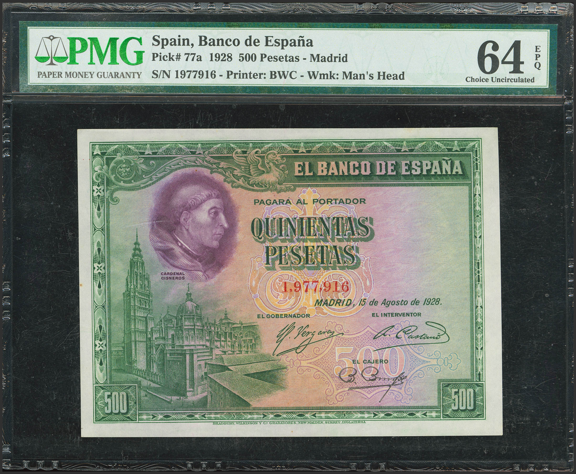 500 Pesetas. 15 de Agosto de 1928. Sin serie. (Edifil 2023: 356, Pick: 77a). Apresto original. SC. Encapsulado PMG64EPQ.