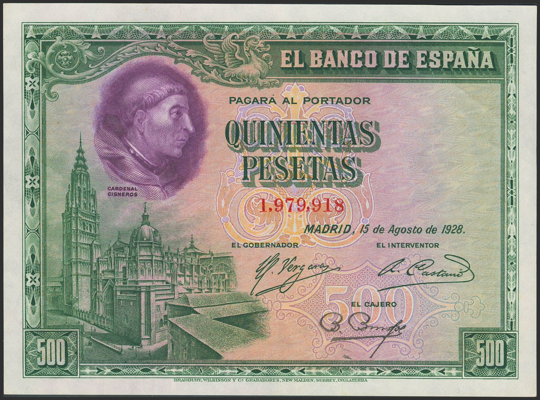 500 Pesetas. 15 de Agosto de 1928. Sin serie. (Edifil 2023: 356). Apresto original. SC-.