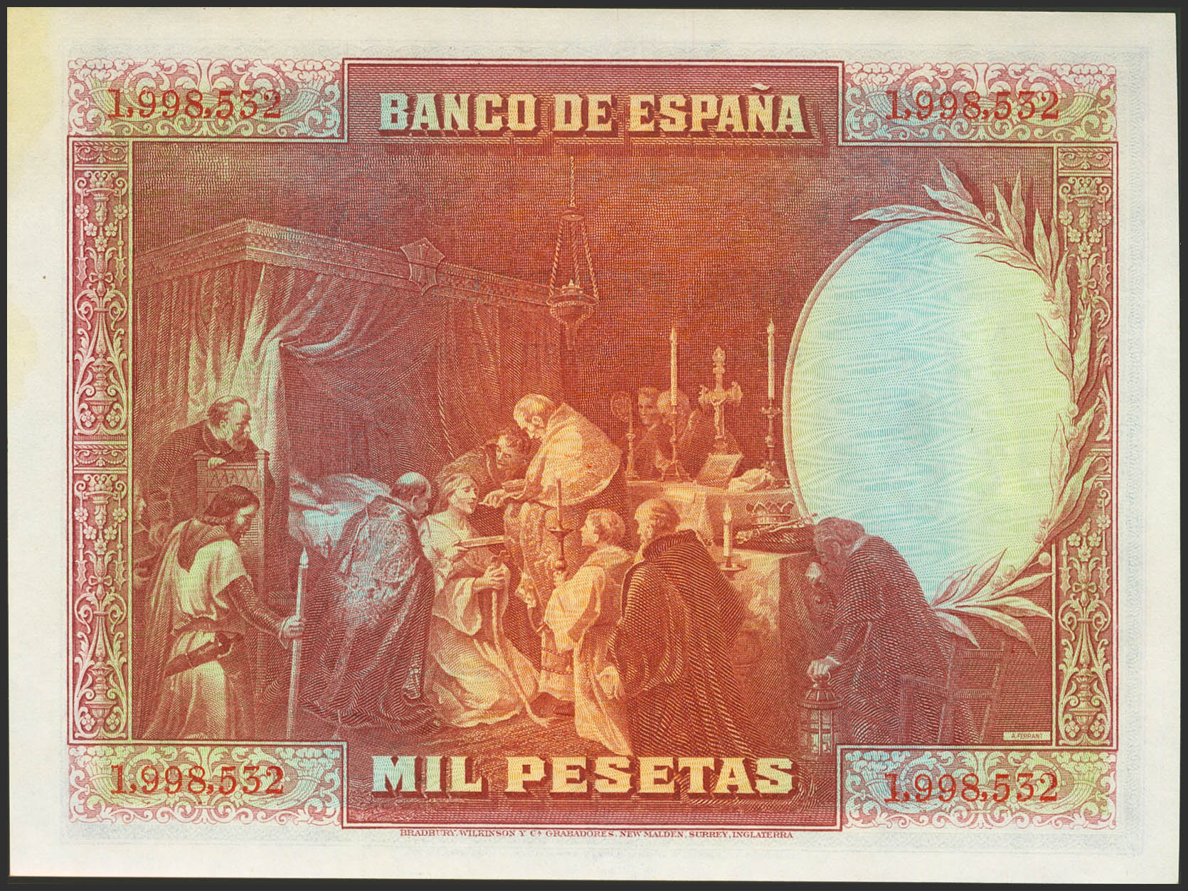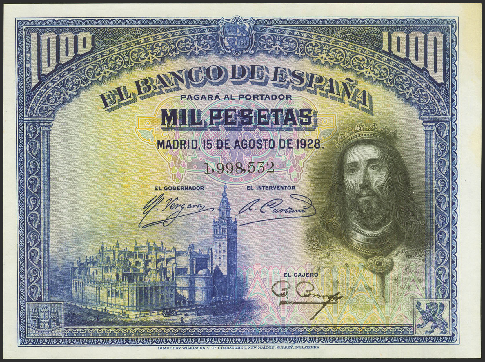 1000 Pesetas. 15 de Agosto de 1928. Sin serie. (Edifil 2023: 357). Conserva todo su apresto original y manchitas del tiempo en el margen derecho. SC-.