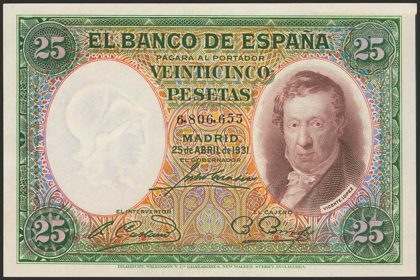 25 Pesetas. 25 de Abril de 1931. Sin serie. (Edifil 2023: 358). Conserva todo su apresto original. SC-.
