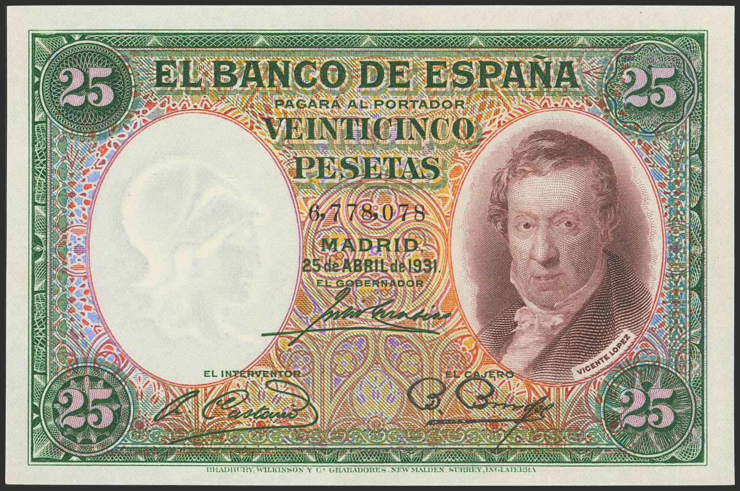25 Pesetas. 25 de Abril de 1931. Sin serie. (Edifil 2023: 358). Conserva gran parte de su apresto original. EBC+++.