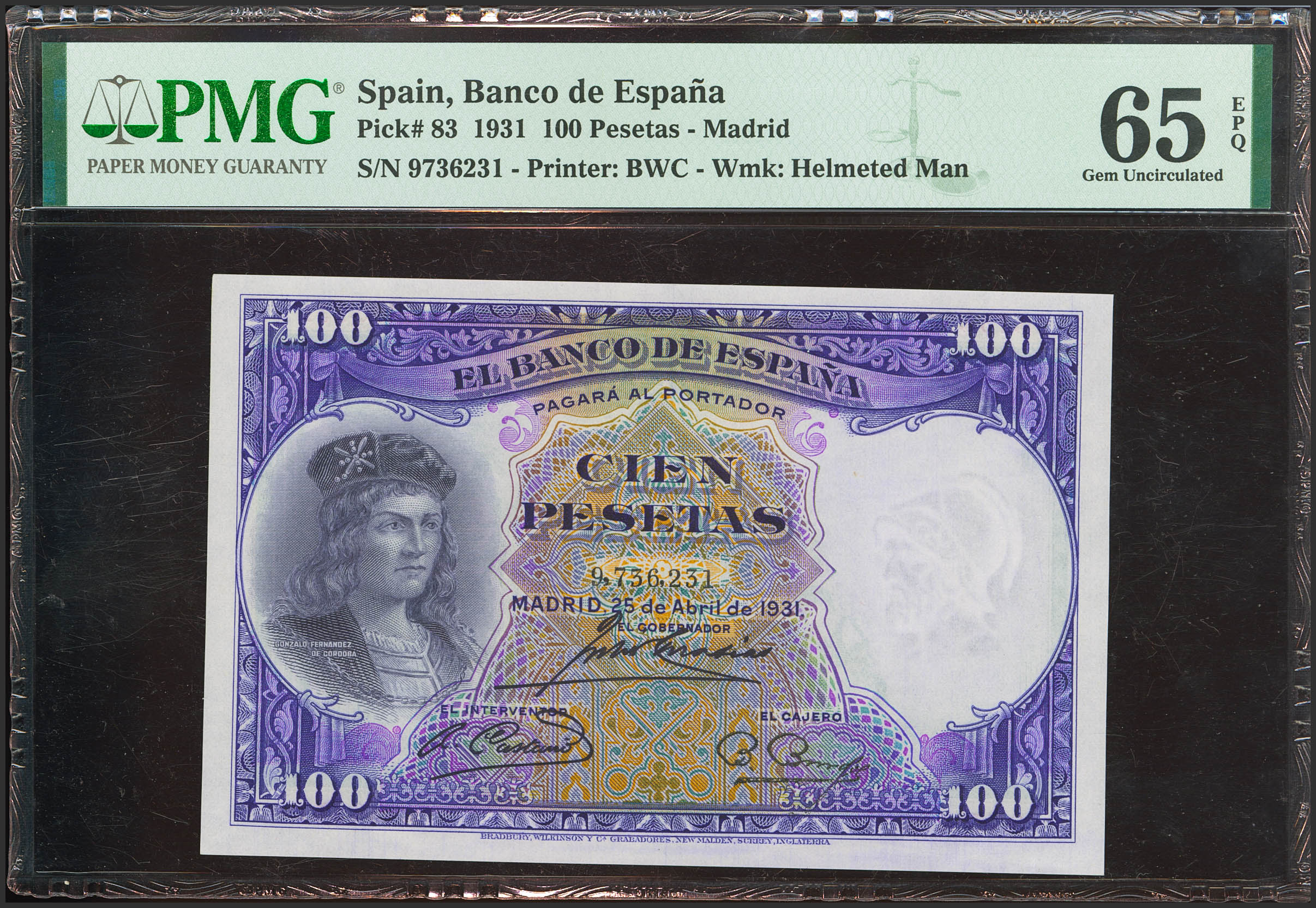 100 Pesetas. 25 de Abril de 1931. Sin serie. (Edifil 2021: 360, Pick: 83). Apresto original. SC. Encapsulado PMG65EPQ.