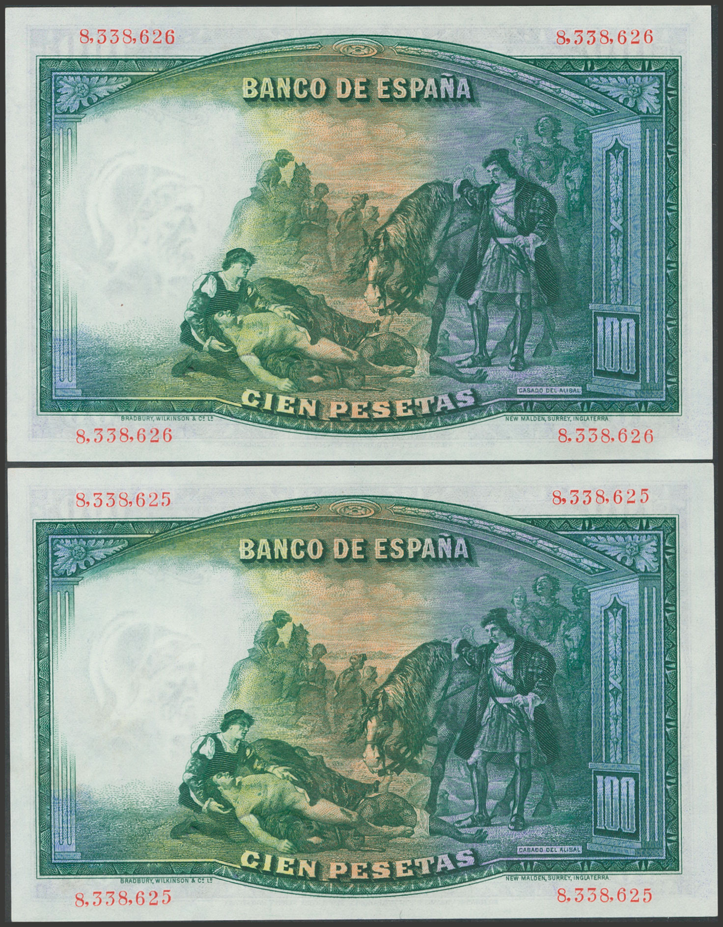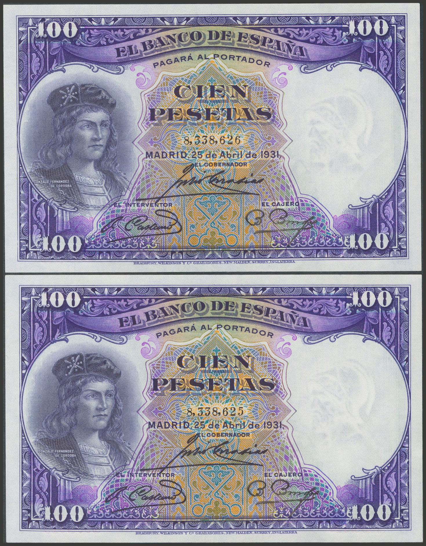 100 Pesetas. 25 de Abril de 1931. Pareja correlativa. Sin serie. (Edifil 2017: 360). Conserva todo su apresto original. SC-.
