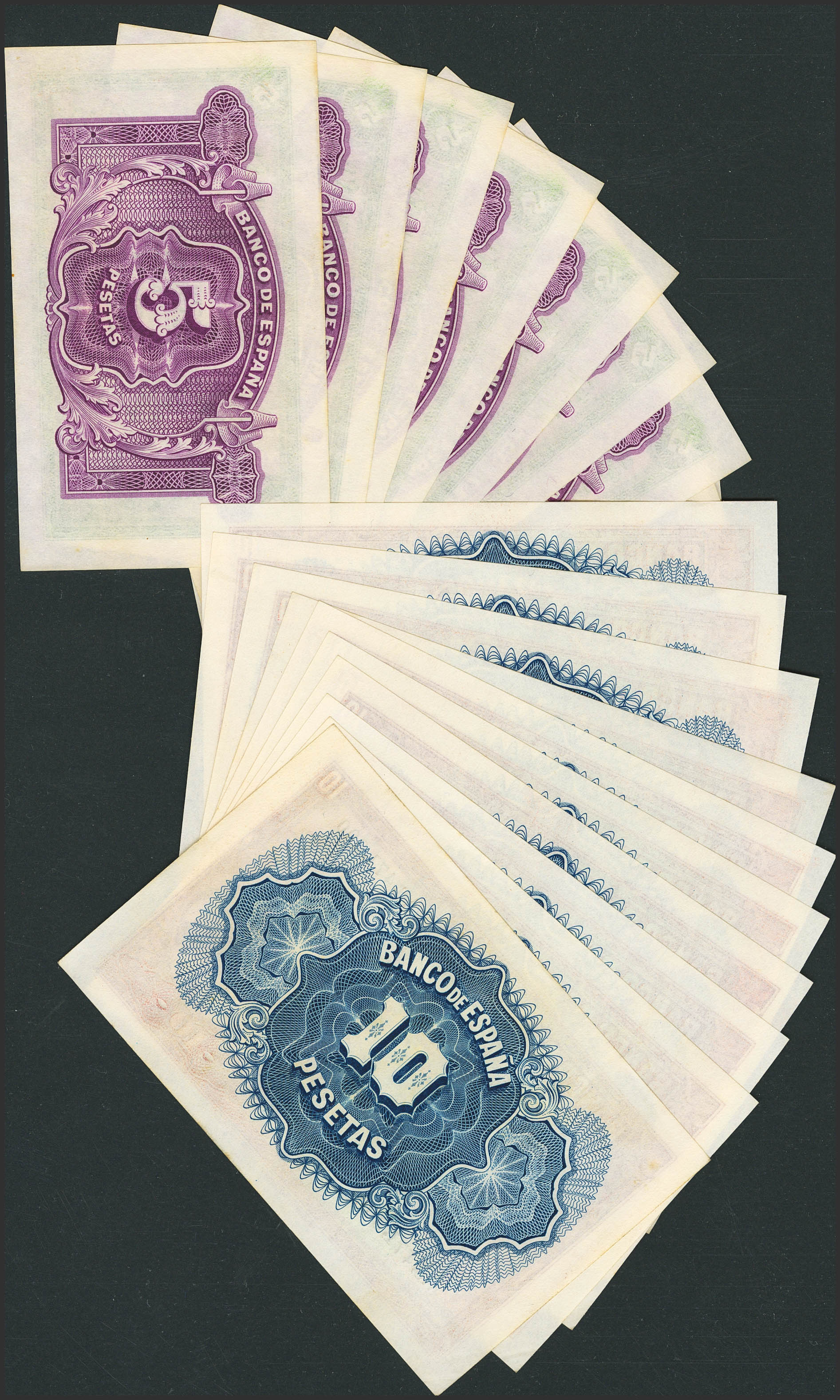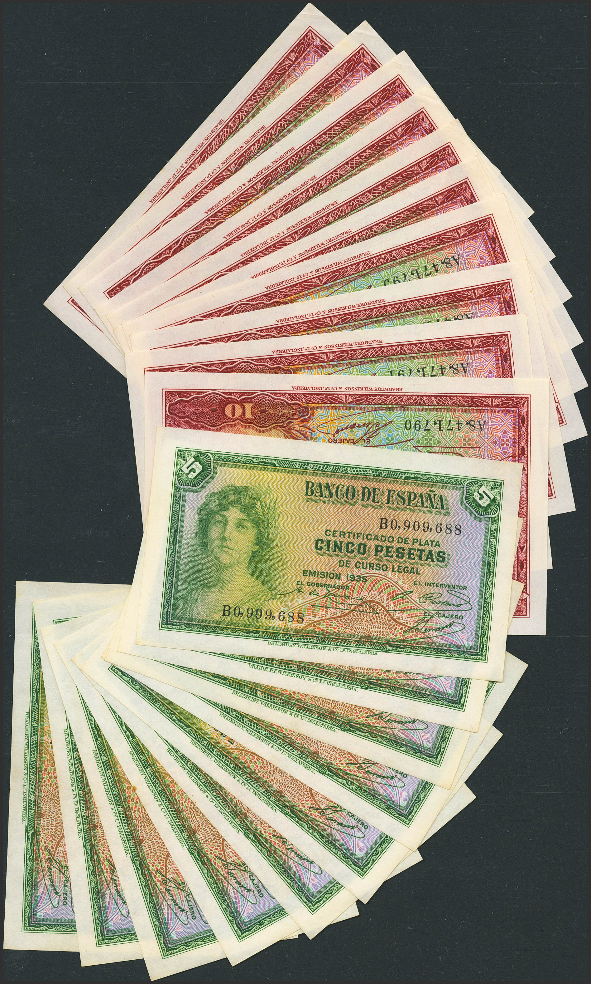 Conjunto de 10 billetes correlativos (a excepción del 10 Pesetas que hay un salto) de 5 Pesetas y 10 Pesetas Certificado de Plata emitidos en 1935 y ambos con las series B y A, respectivamente (Edifil 2021: 2021: 363a, 364a), conservando todo su apresto original. SC/SC-.