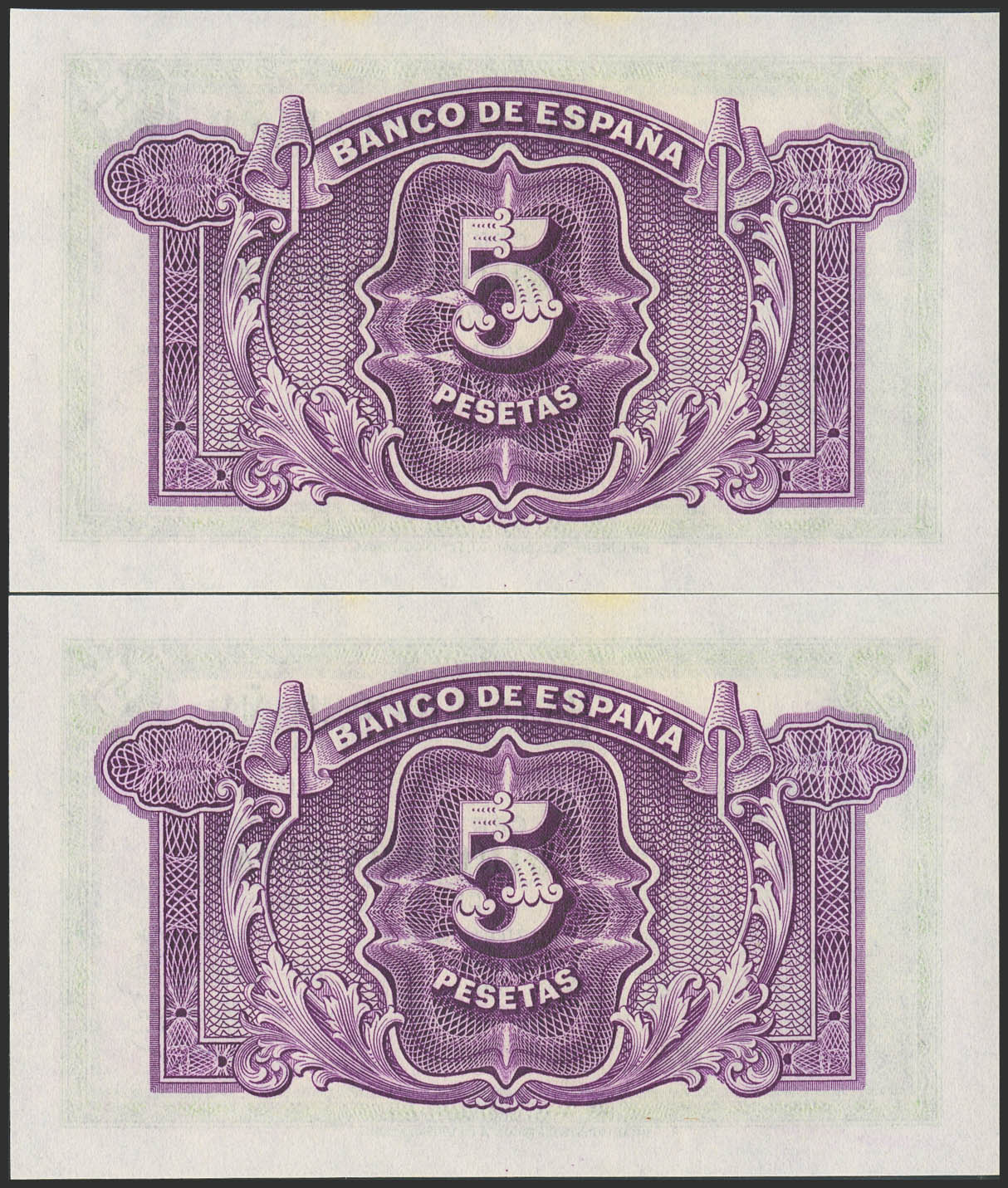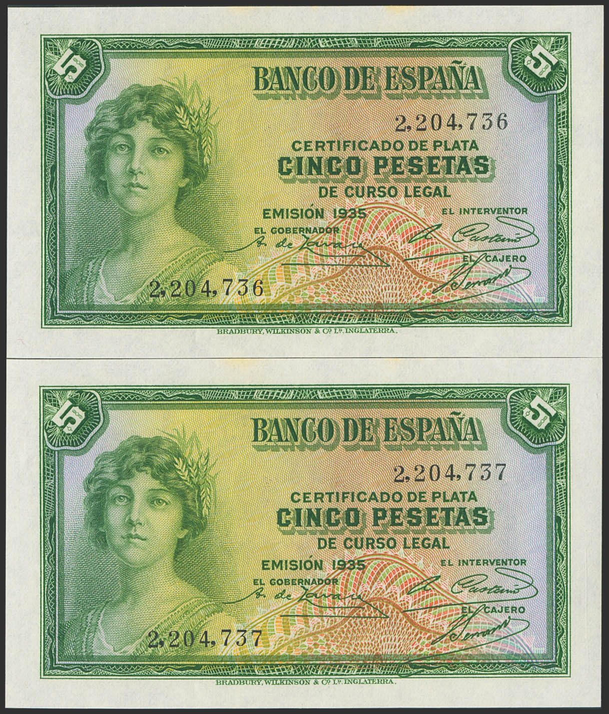 5 Pesetas. 1935. Certificado de Plata. Pareja correlativa. Sin serie. (Edifil 2023: 363). Apresto original. SC-.