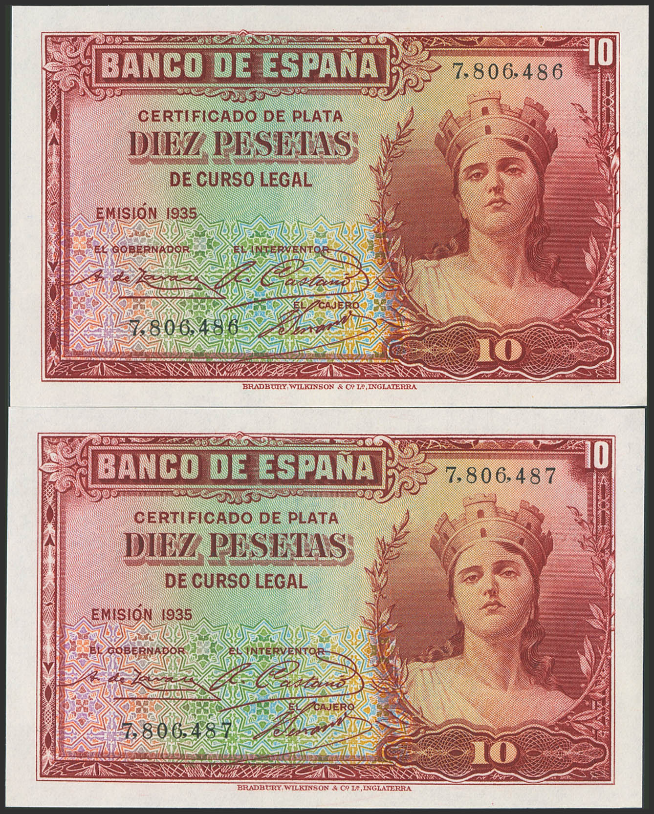 10 Pesetas. 1935. Certificado de Plata. Pareja correlativa. Sin serie. (Edifil 2023: 364). Apresto original. SC.