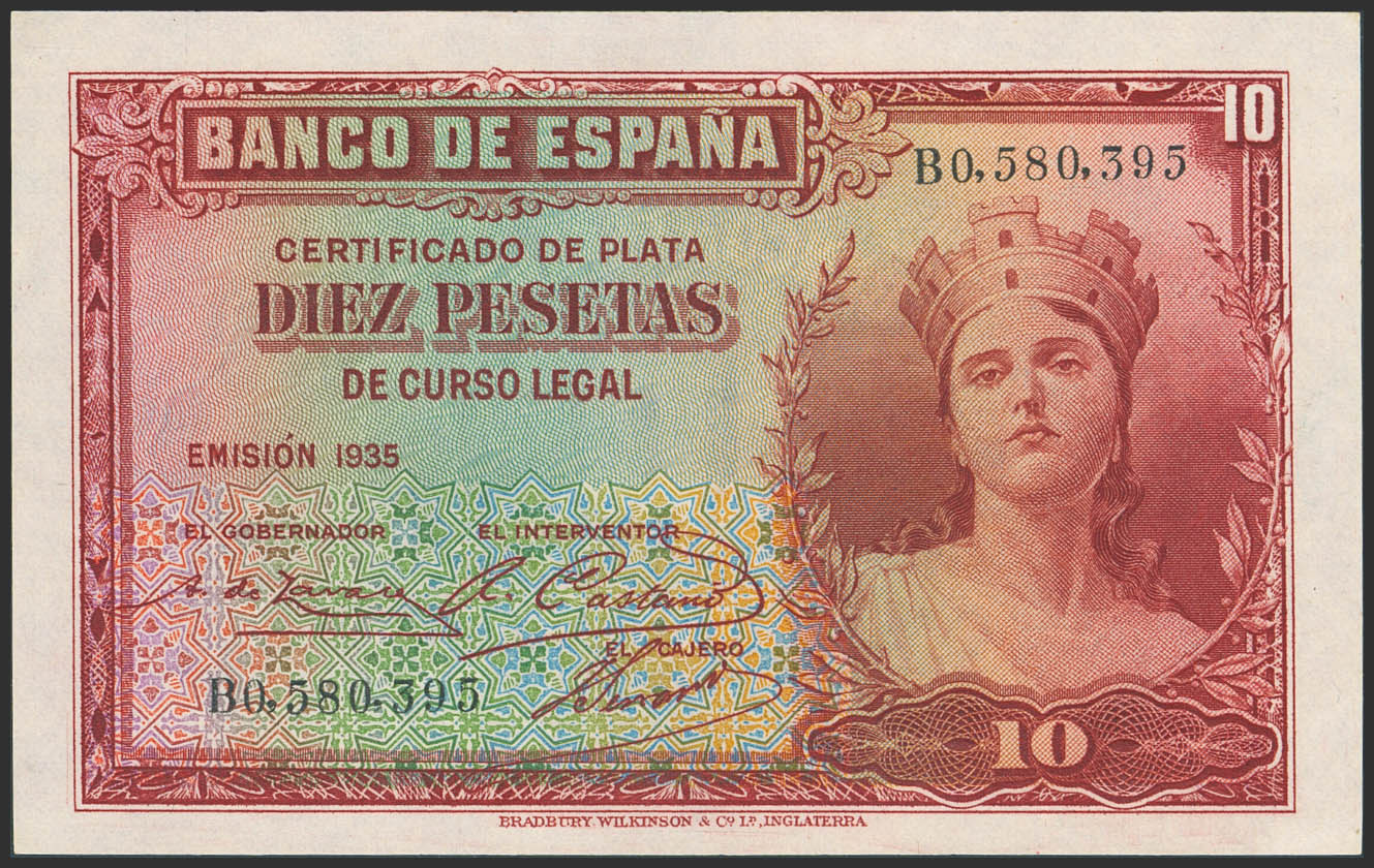 10 Pesetas. 1935. Certificado de Plata. Serie B. (Edifil 2023: 364a). Conserva todo su apresto original. SC.