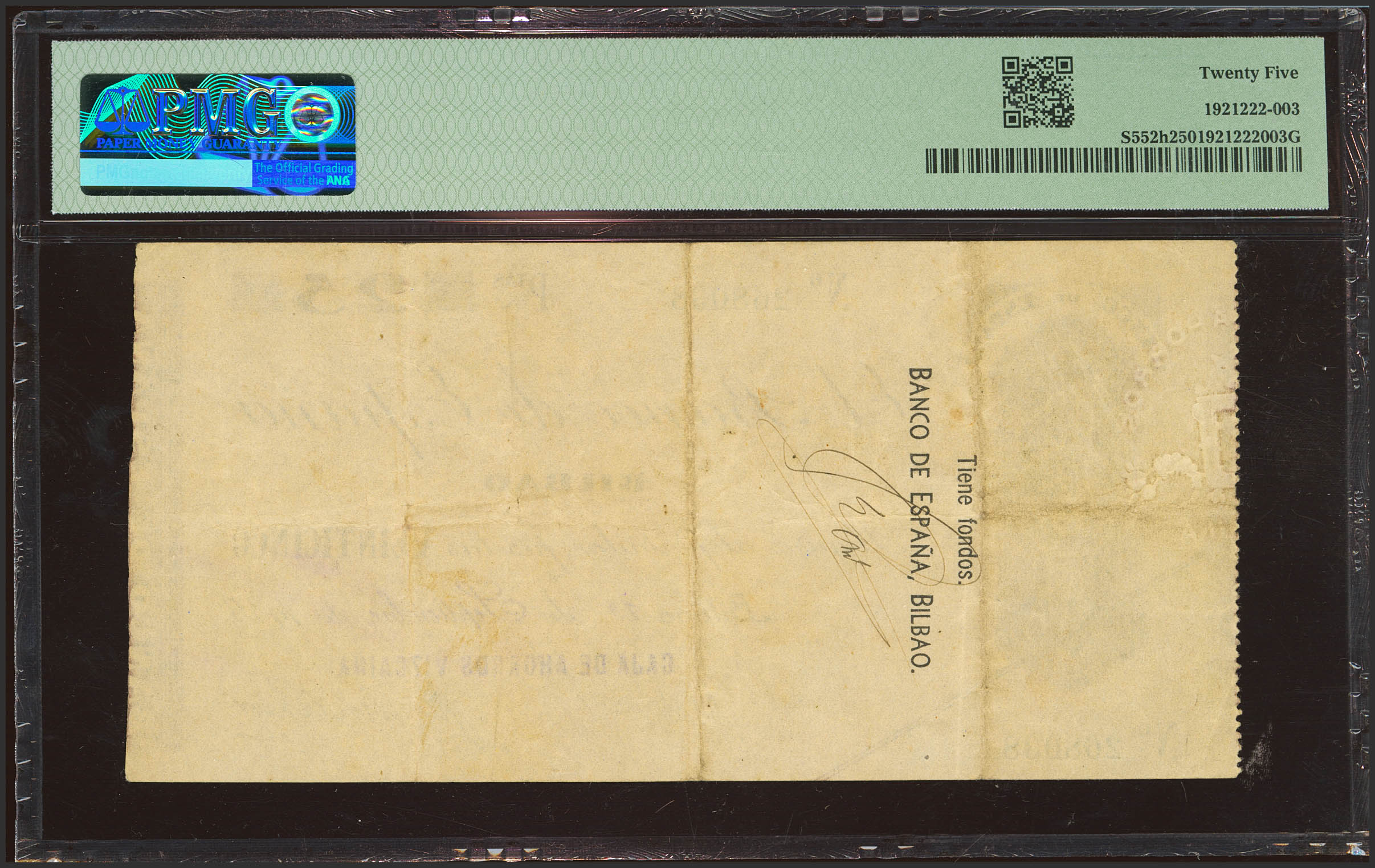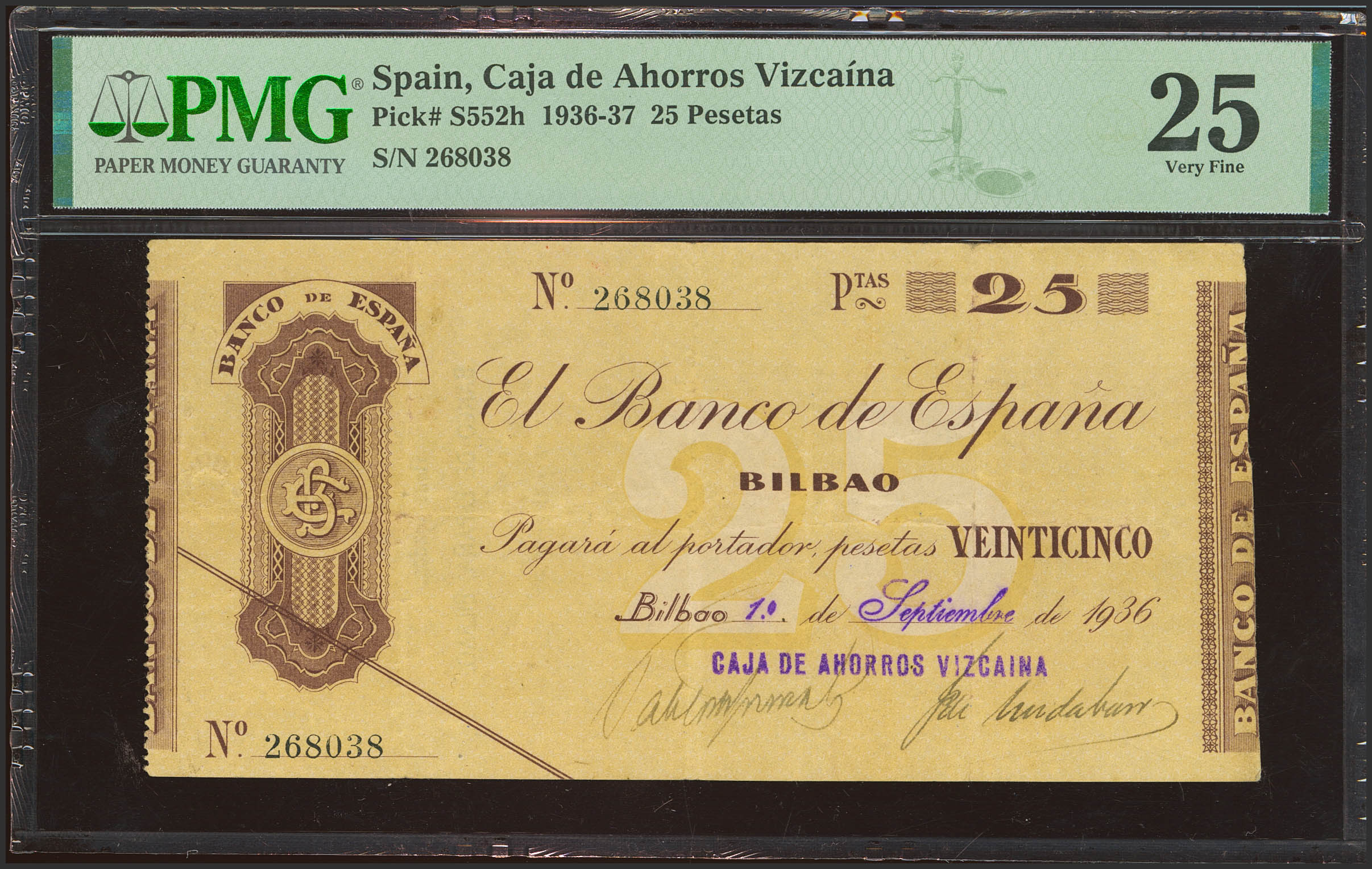 25 Pesetas. 1 de Septiembre de 1936. Sin serie. Sucursal de Bilbao y antefirma Caja de Ahorros Vizcaína. (Edifil 2023: 369i, Pick: S552h). MBC+. Encapsulado PMG25.