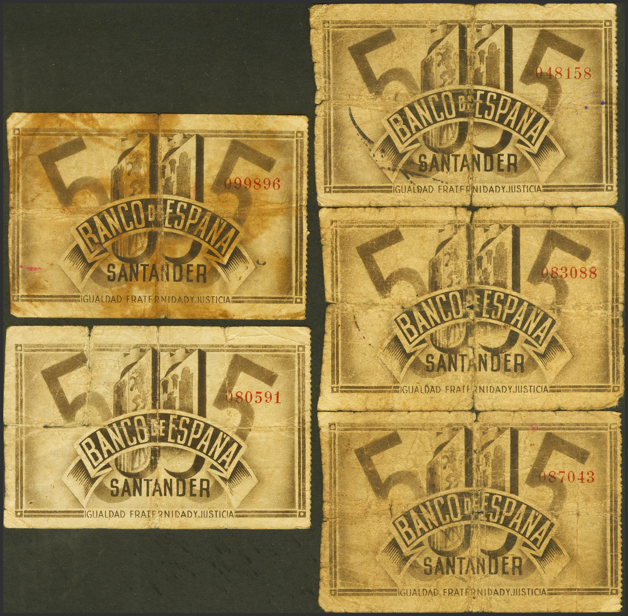 Conjunto de 5 billetes de 5 Pesetas del Banco de Santander, emitidos el 1 de Noviembre de 1936, todos ellos sin serie y con diversas antefirmas. (Edifil 2023: 375). MBC-/BC+.