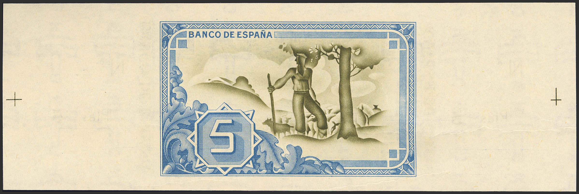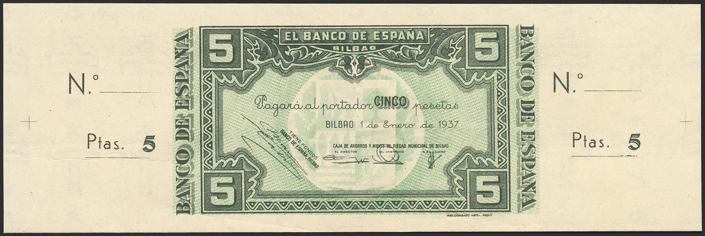 5 Pesetas. 1 de Enero de 1937. Sucursal de Bilbao, antefirma Caja de Ahorros y Monte de Piedad Municipal de Bilbao. Sin serie y sin numeración, con ambas matrices. (Edifil 2023: 385a). Apresto original, arruguitas naturales del papel. SC-.