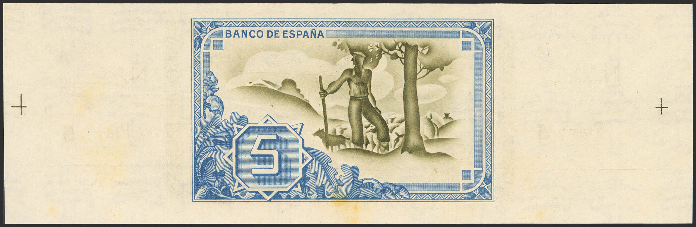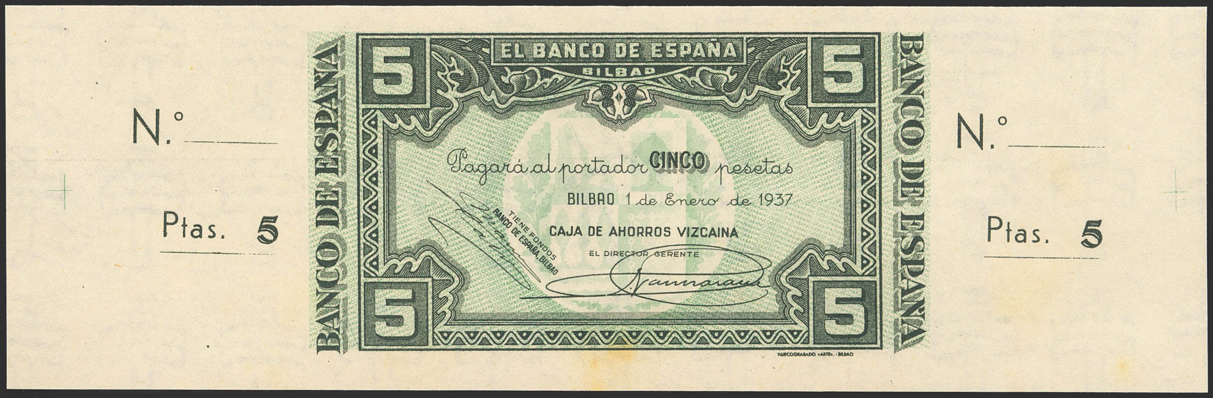 5 Pesetas. 1 de Enero de 1937. Sucursal de Bilbao, antefirma Caja de Ahorros Vizcaína. Sin serie y sin numeración, con ambas matrices. (Edifil 2023: 385b). Apresto original, habituales manchitas del tiempo. SC-.