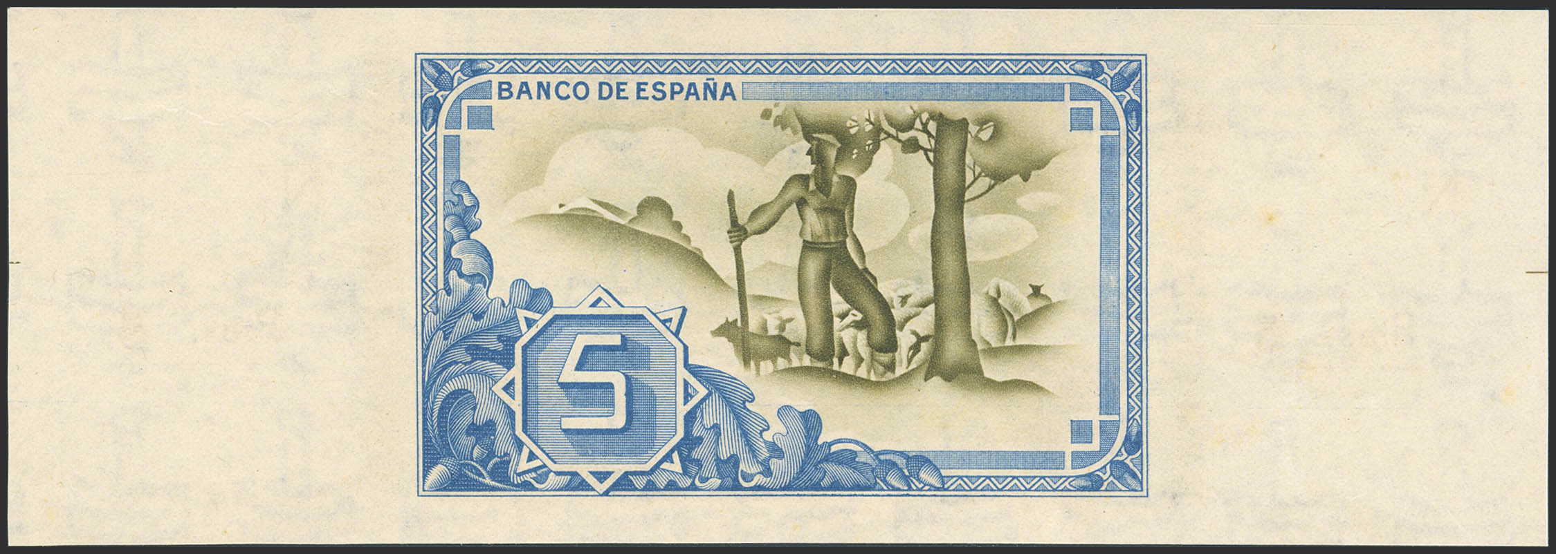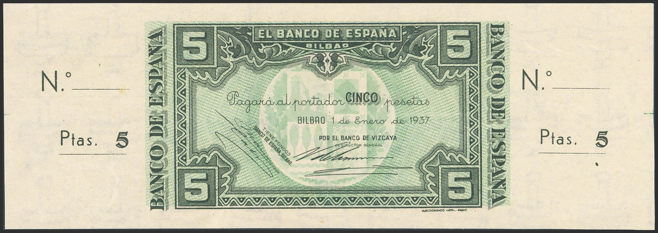 5 Pesetas. 1 de Enero de 1937. Sucursal de Bilbao, antefirma Banco de Vizcaya. Sin serie y sin numeración, con ambas matrices. (Edifil 2023: 385f). Apresto original. SC--.
