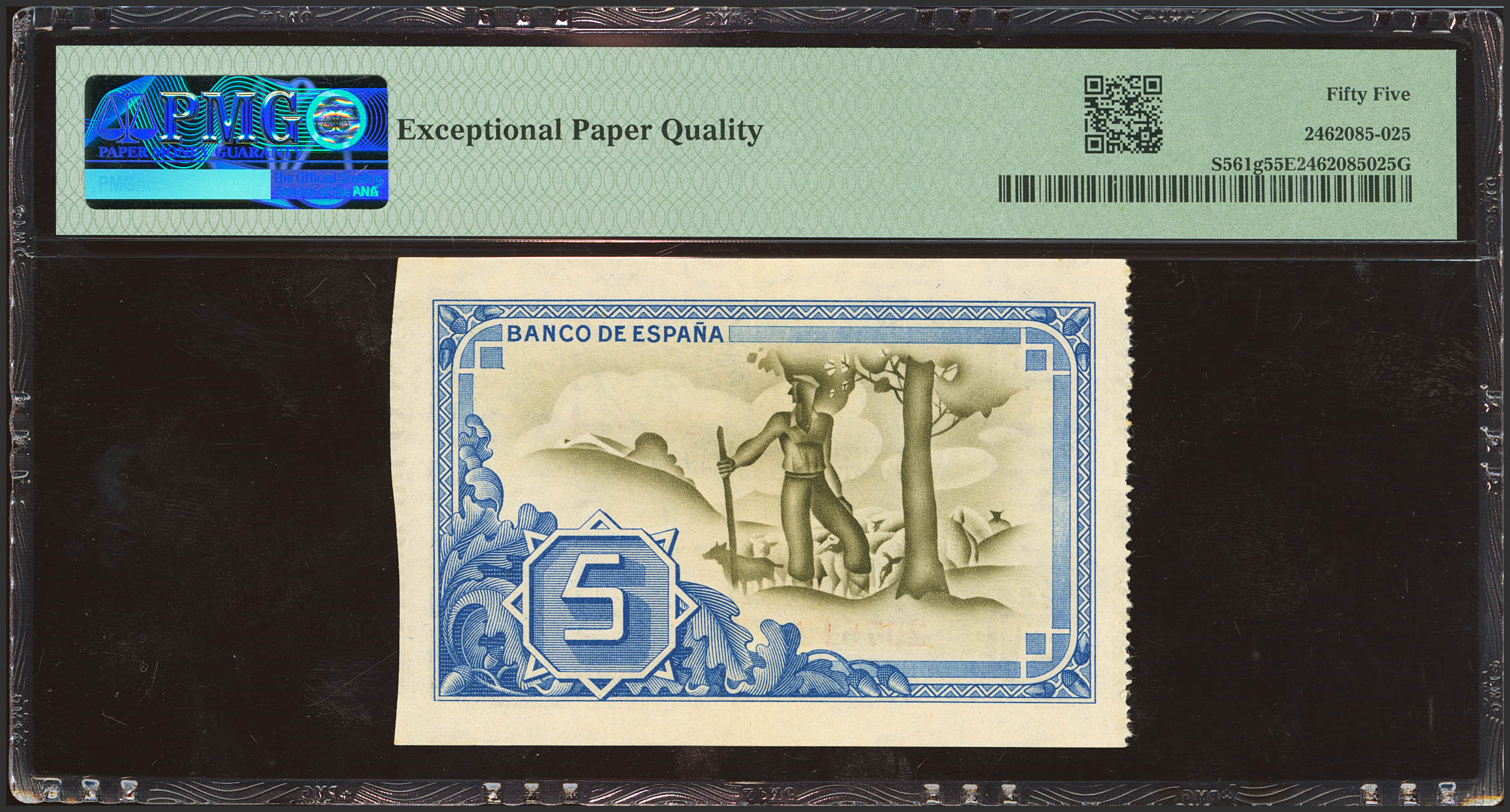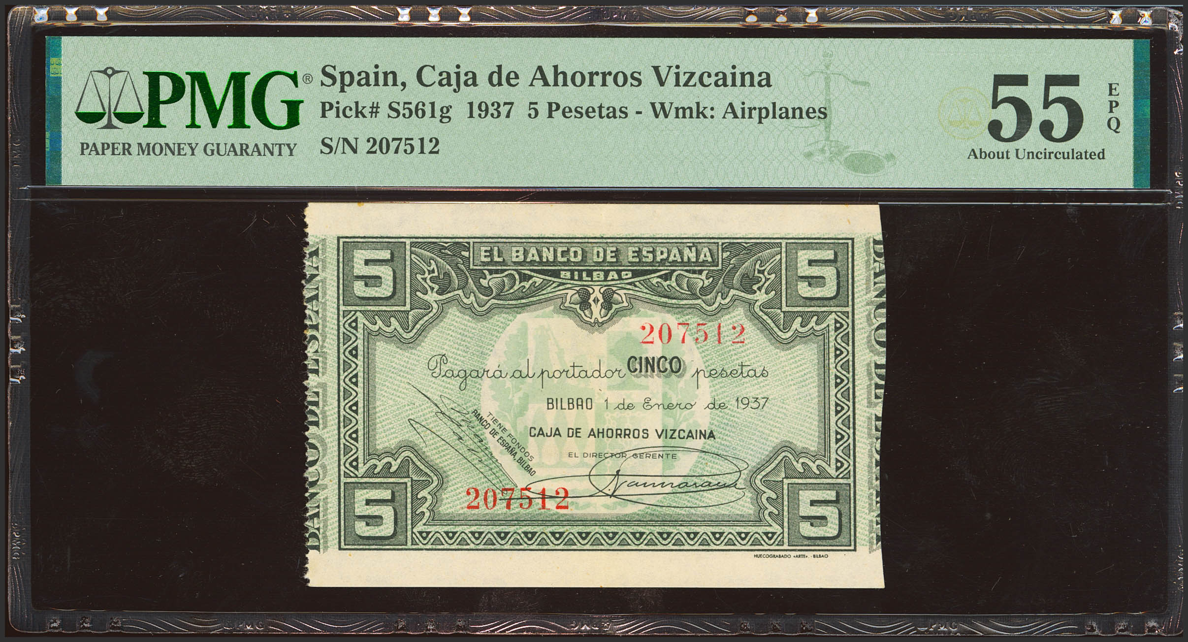 5 Pesetas. 1 de Enero de 1937. Sucursal de Bilbao, antefirma Caja de Ahorros Vizcaína. Sin serie y sin matrices. (Edifil 2023: 385b, Pick: S561g). Apresto original. EBC+. Encapsulado PMG55EPQ.