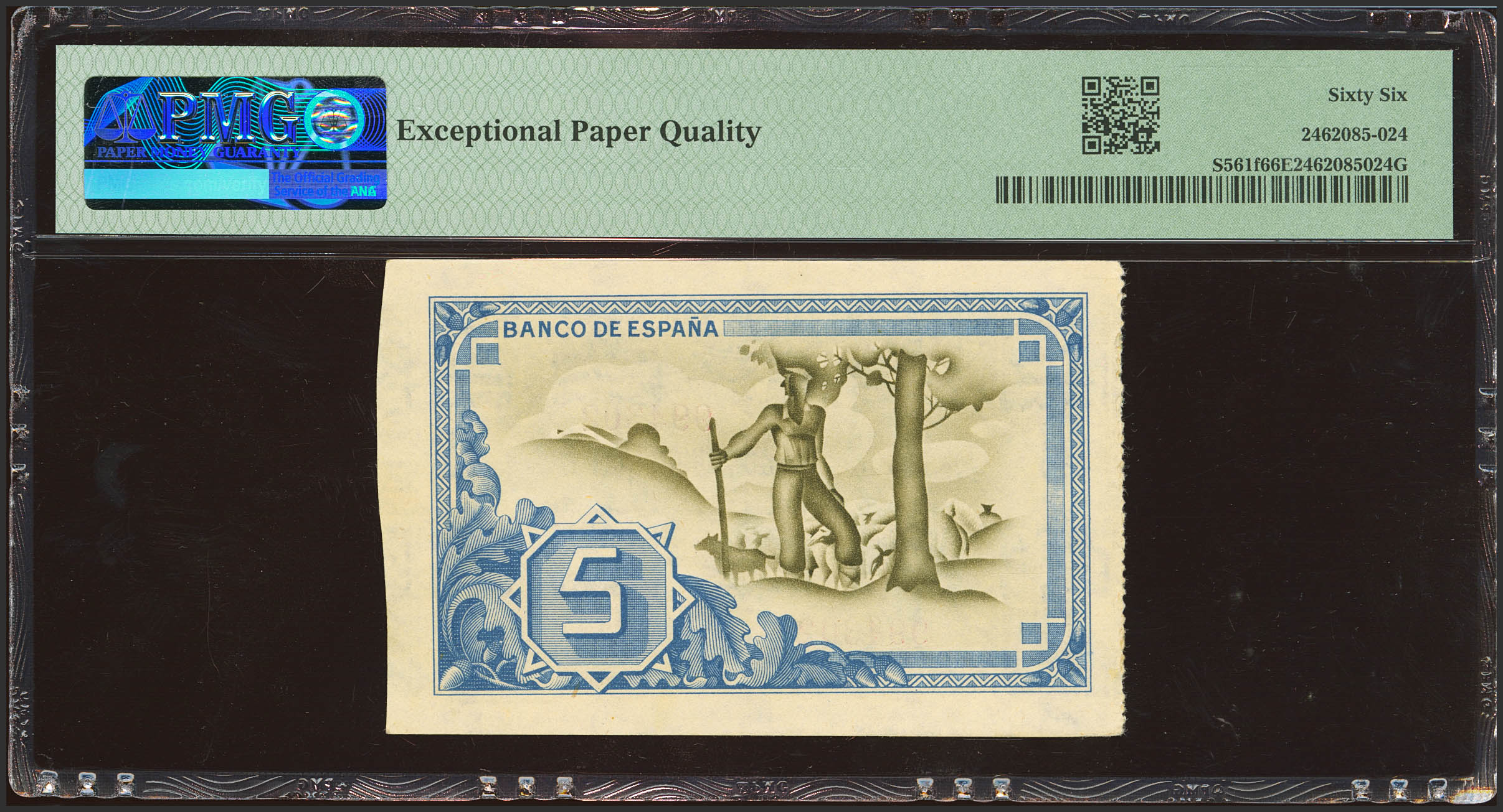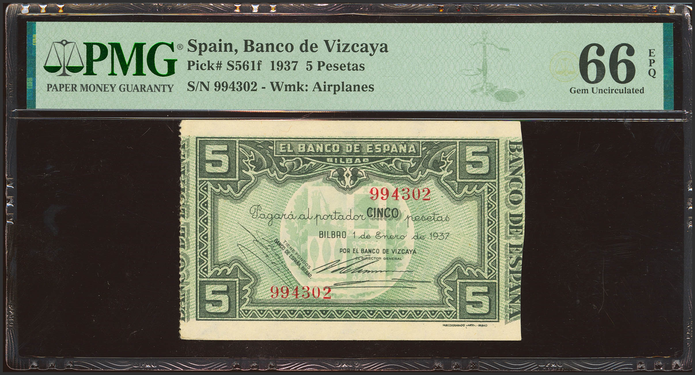 5 Pesetas. 1 de Enero de 1937. Sucursal de Bilbao, antefirma Banco de Vizcaya. Sin serie y sin matrices. (Edifil 2023: 385f, Pick: S561f). Apresto original. SC. Encapsulado PMG66EPQ.