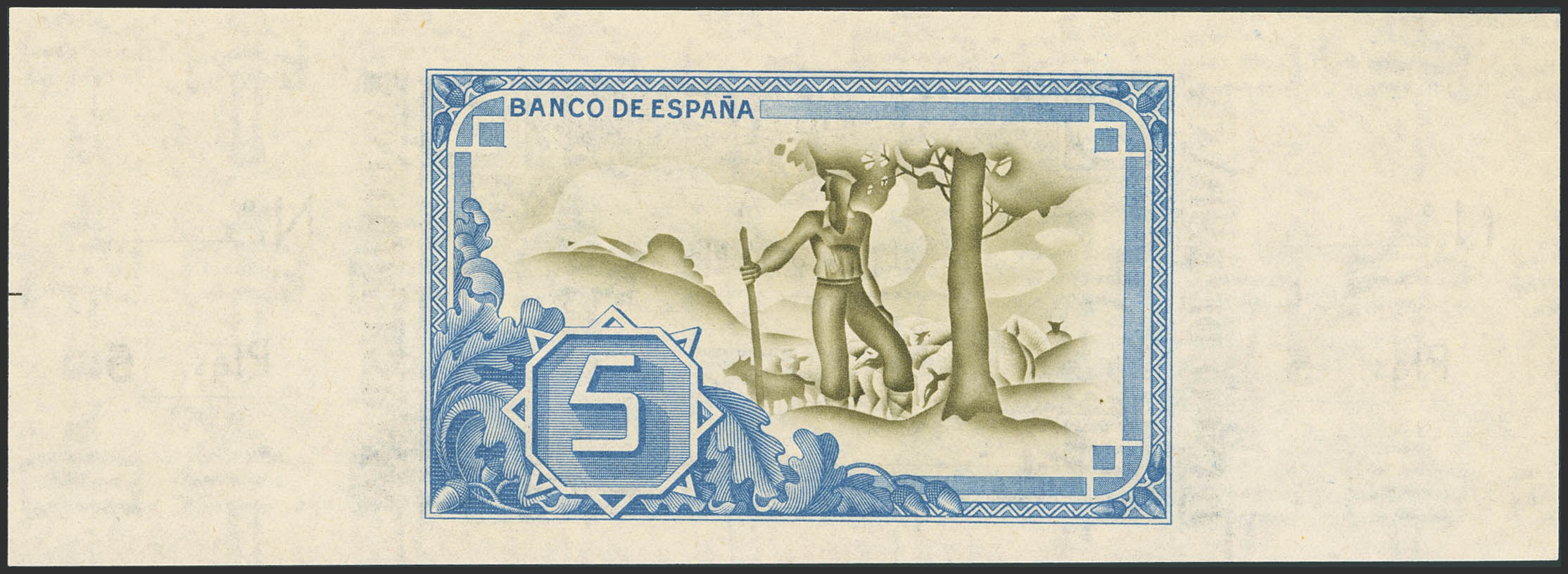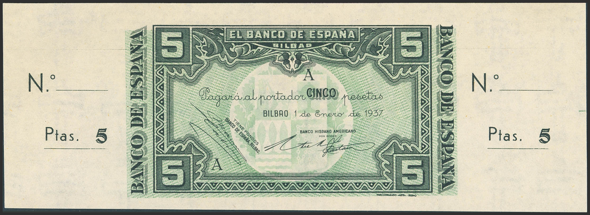 5 Pesetas. 1 de Enero de 1937. Sucursal de Bilbao, antefirma Banco Hispano Americano. Serie A y sin numeración, con ambas matrices. (Edifil 2023: 386a). Apresto original. SC.