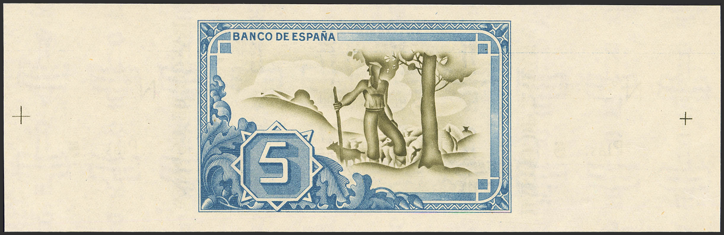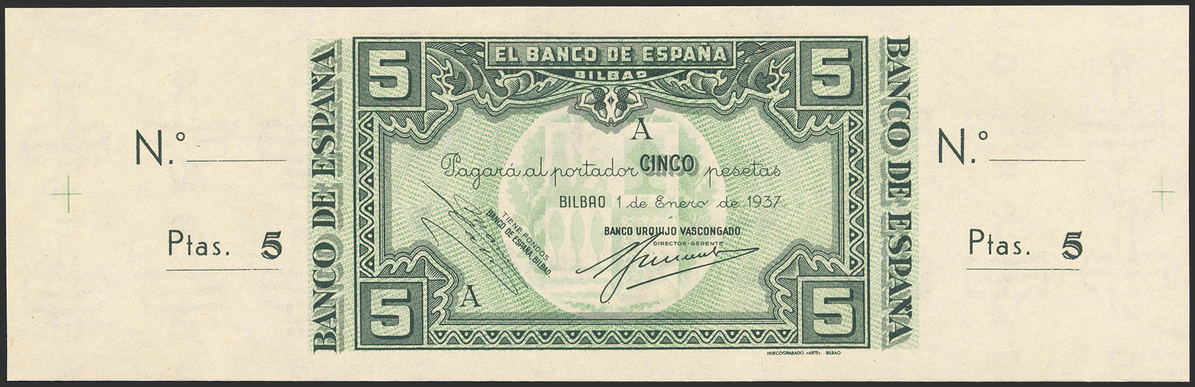 5 Pesetas. 1 de Enero de 1937. Sucursal de Bilbao, antefirma Banco Urquijo Vascongado. Serie A y sin numeración, con ambas matrices. (Edifil 2023: 386f). Apresto original. SC.