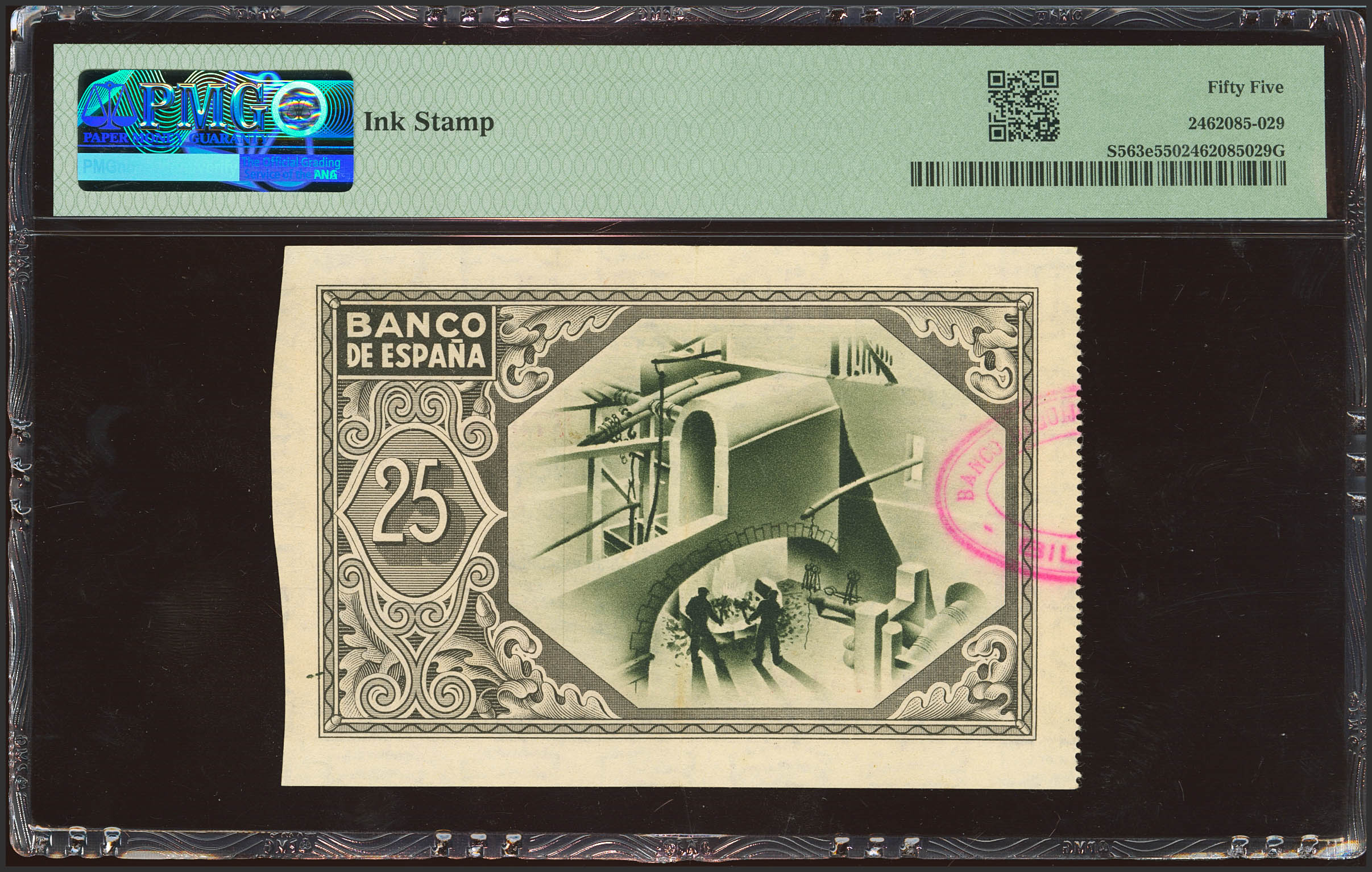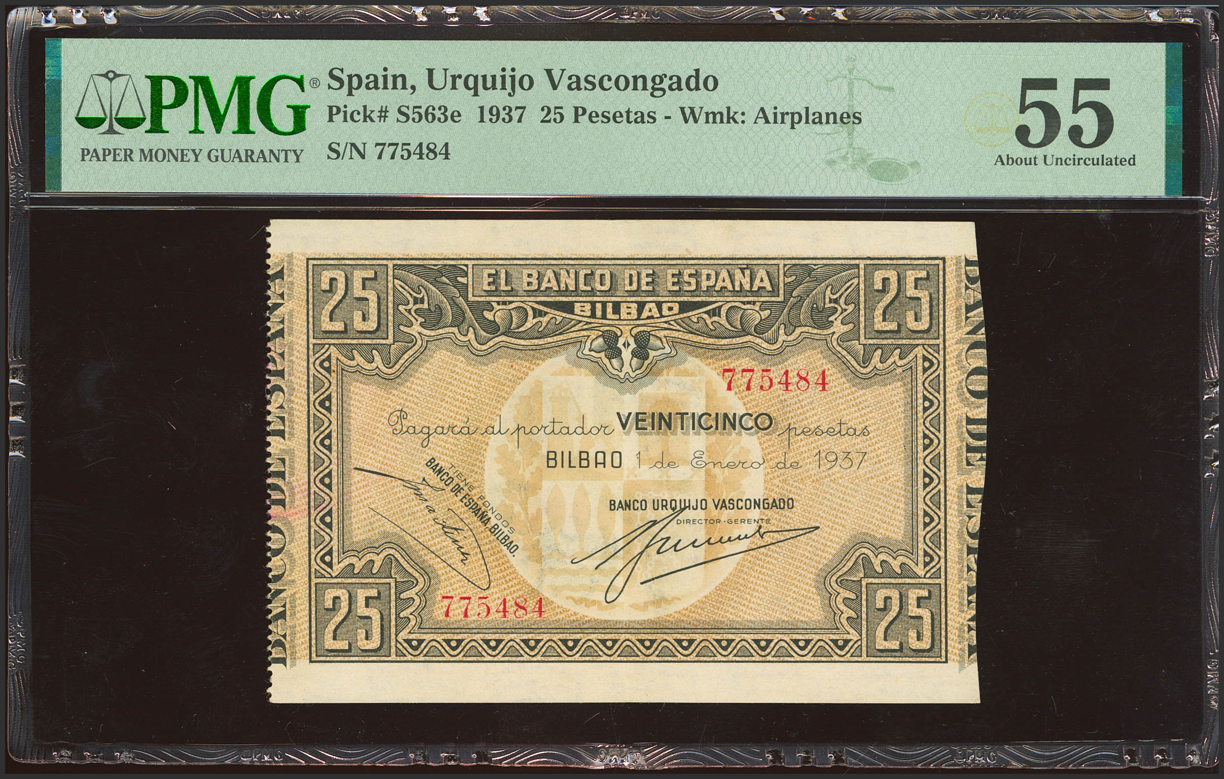 25 Pesetas. 1 de Enero de 1937. Sucursal de Bilbao, antefirma Banco Urquijo Vascongado. Sin serie y sin matrices. (Edifil 2023: 388c, Pick: S563e). EBC+. Encapsulado PMG55.
