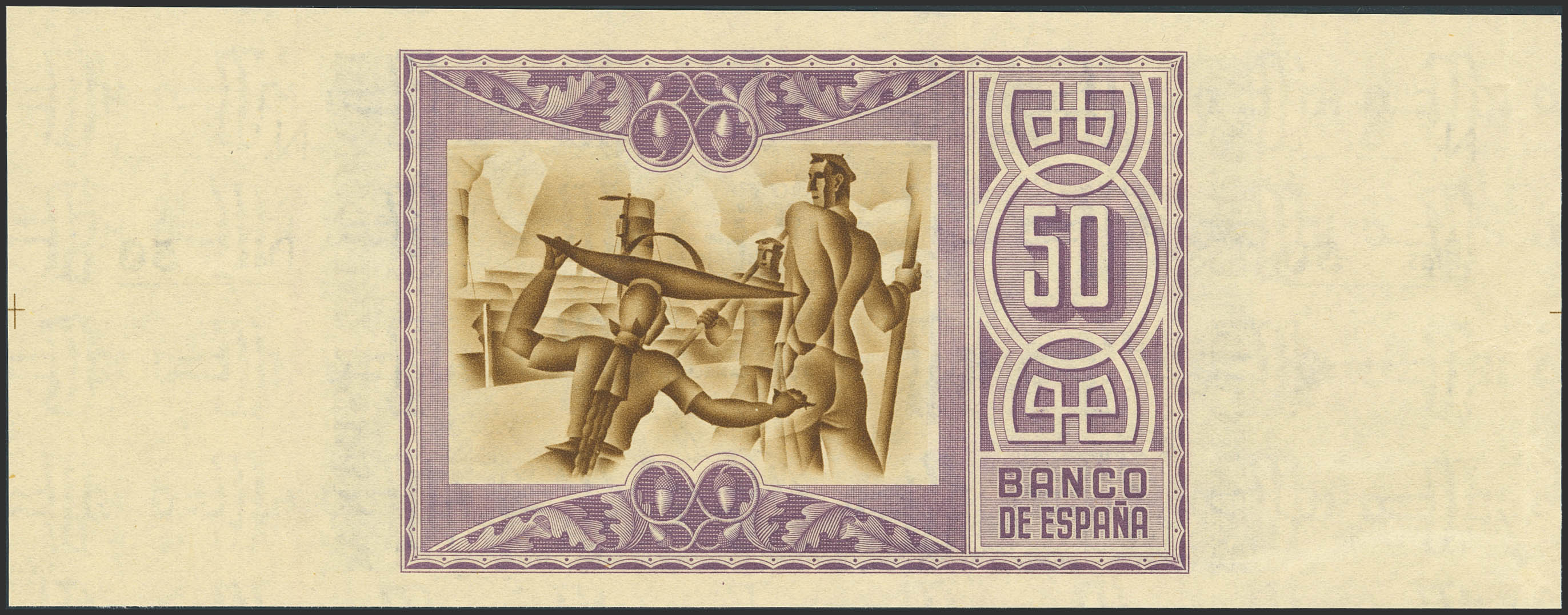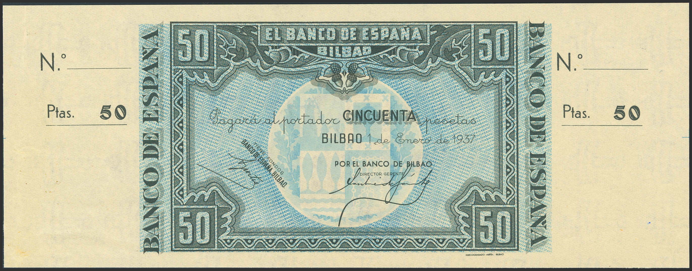 50 Pesetas. 1 de Enero de 1937. Sucursal de Bilbao, antefirma Banco de Bilbao. Sin serie y sin numeración, con ambas matrices. (Edifil 2023: 389a). Apresto original. SC--.