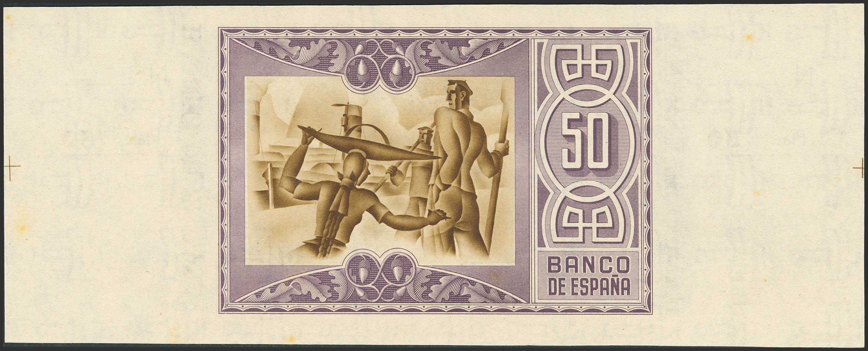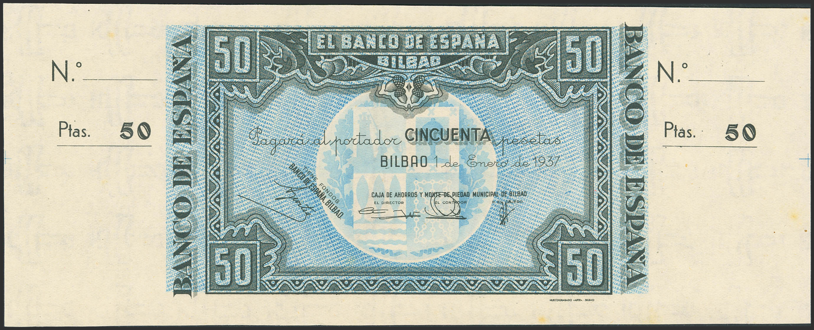 50 Pesetas. 1 de Enero de 1937. Sucursal de Bilbao, antefirma Caja de Ahorros y Monte de Piedad Municipal de Bilbao. Sin serie y sin numeración, con ambas matrices. (Edifil 2023: 389c). SC--.