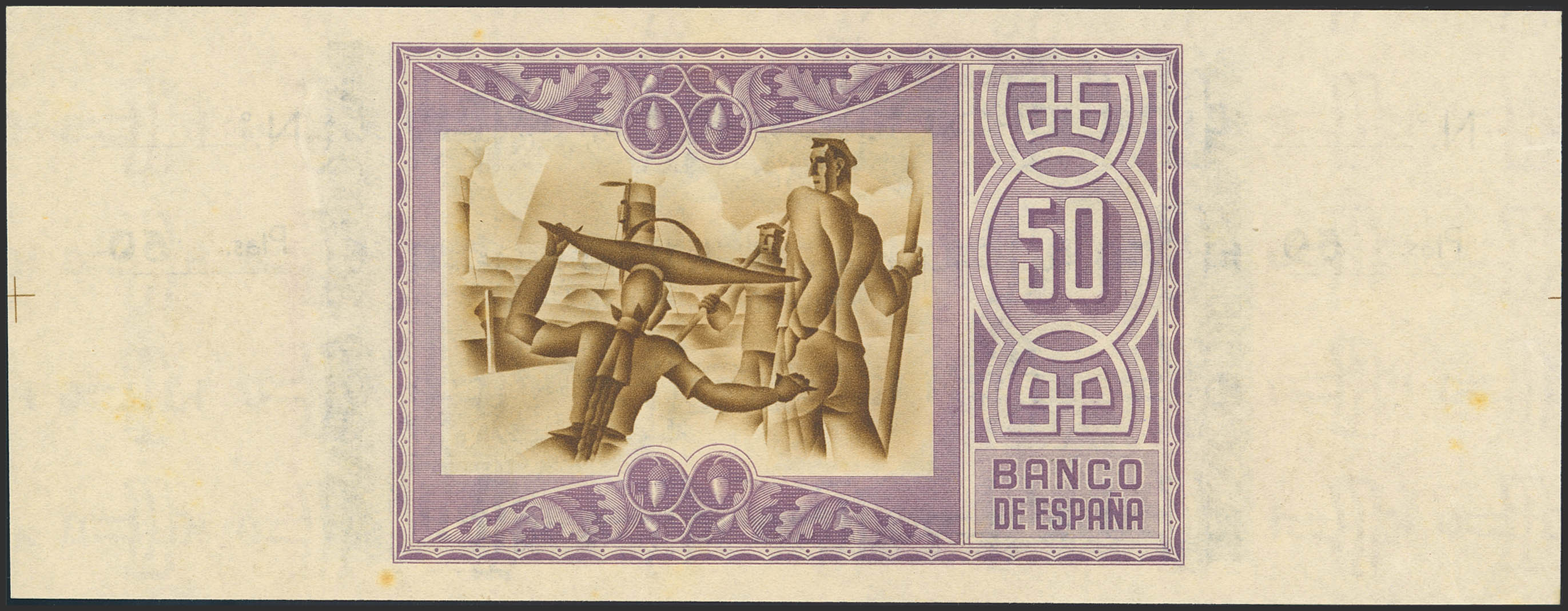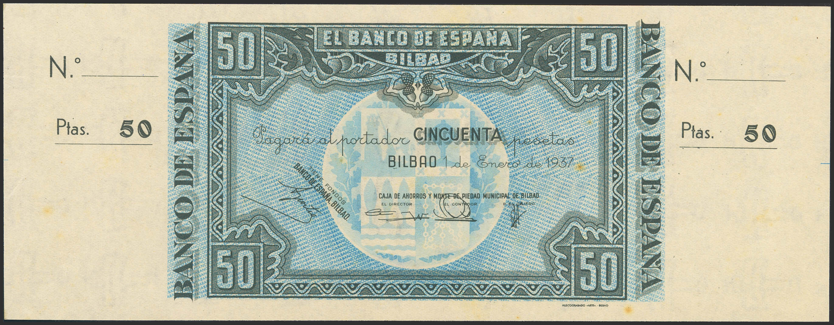 50 Pesetas. 1 de Enero de 1937. Sucursal de Bilbao, antefirma Caja de Ahorros Vizcaína. Sin serie y sin numeración, con ambas matrices. (Edifil 2023: 389f). Apresto original, habituales manchitas del tiempo. SC-.