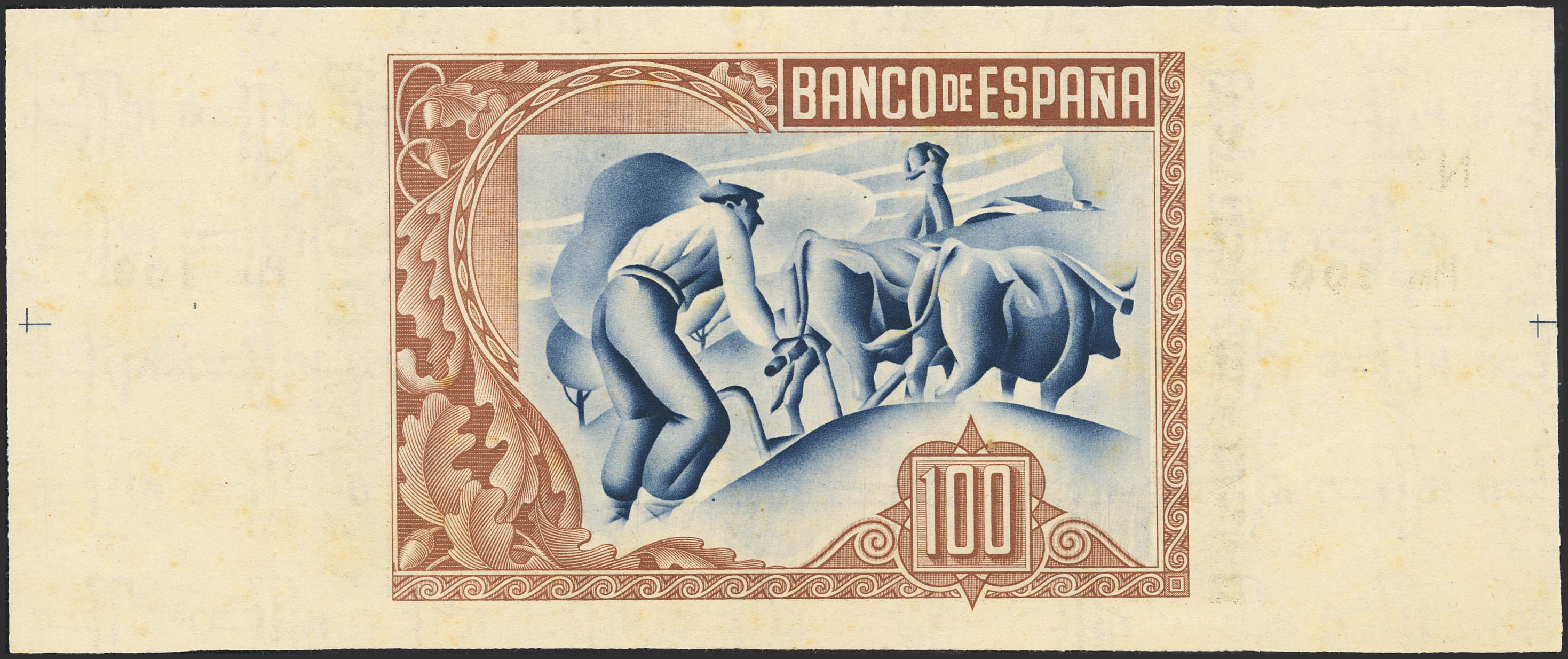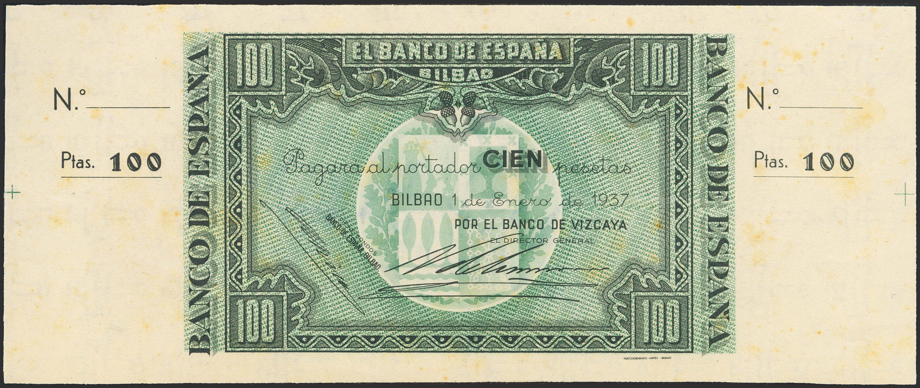100 Pesetas. 1 de Enero de 1937. Sucursal de Bilbao, antefirma Banco de Vizcaya. Sin serie y sin numeración, con ambas matrices. (Edifil 2023: 390b). Manchitas del tiempo. SC--.
