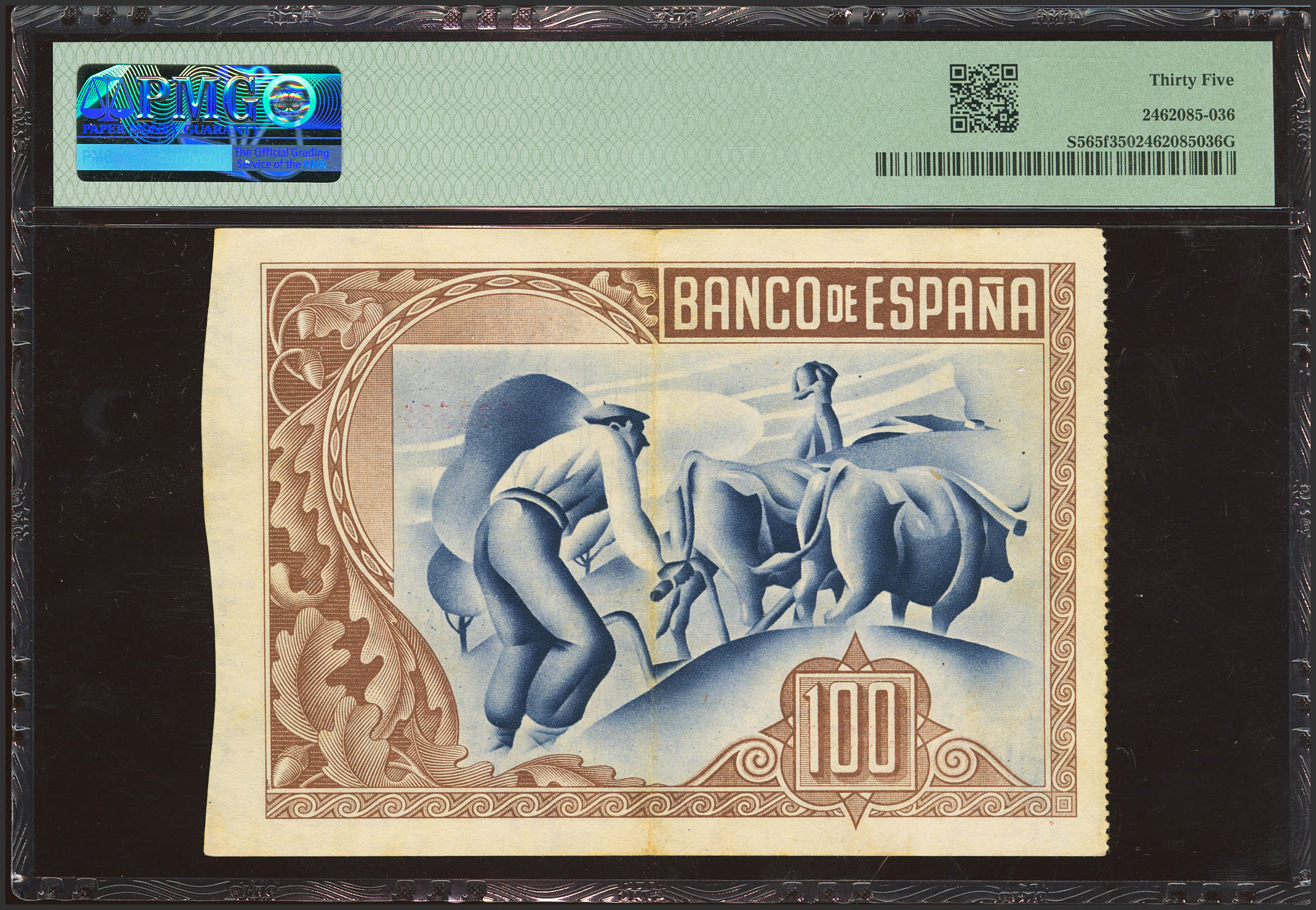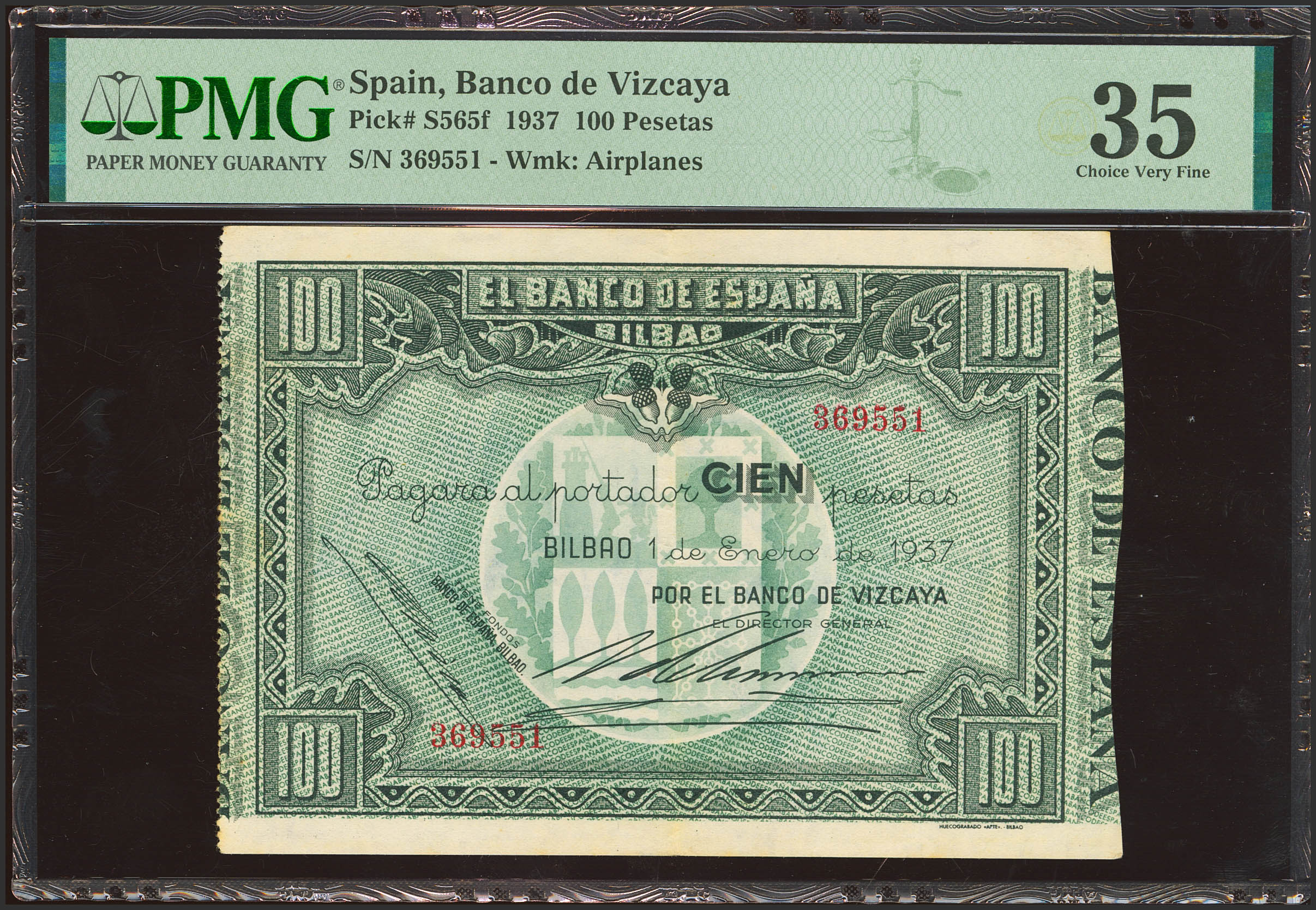 100 Pesetas. 1 de Enero de 1937. Sucursal de Bilbao, antefirma Banco de Vizcaya. Sin serie y sin matrices. (Edifil 2023: 390b, Pick: S565f). MBC+. Encapsulado PMG35.