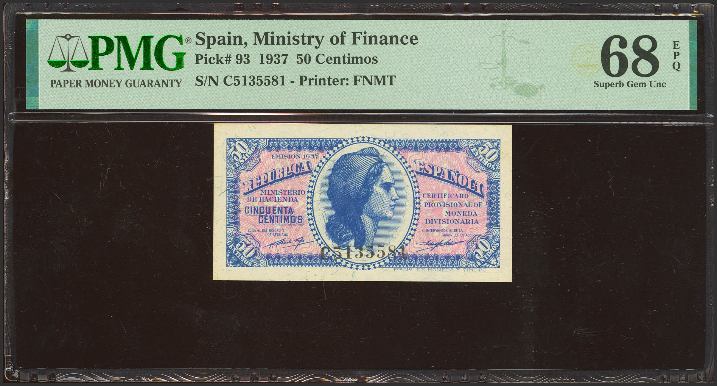 50 Céntimos. 1937. Ministerio de Hacienda. Serie C, última serie emitida. (Edifil 2023: 391a, Pick: 93). Raro en esta excepcional conservación, apresto original. SC. Encapsulado PMG68EPQ.