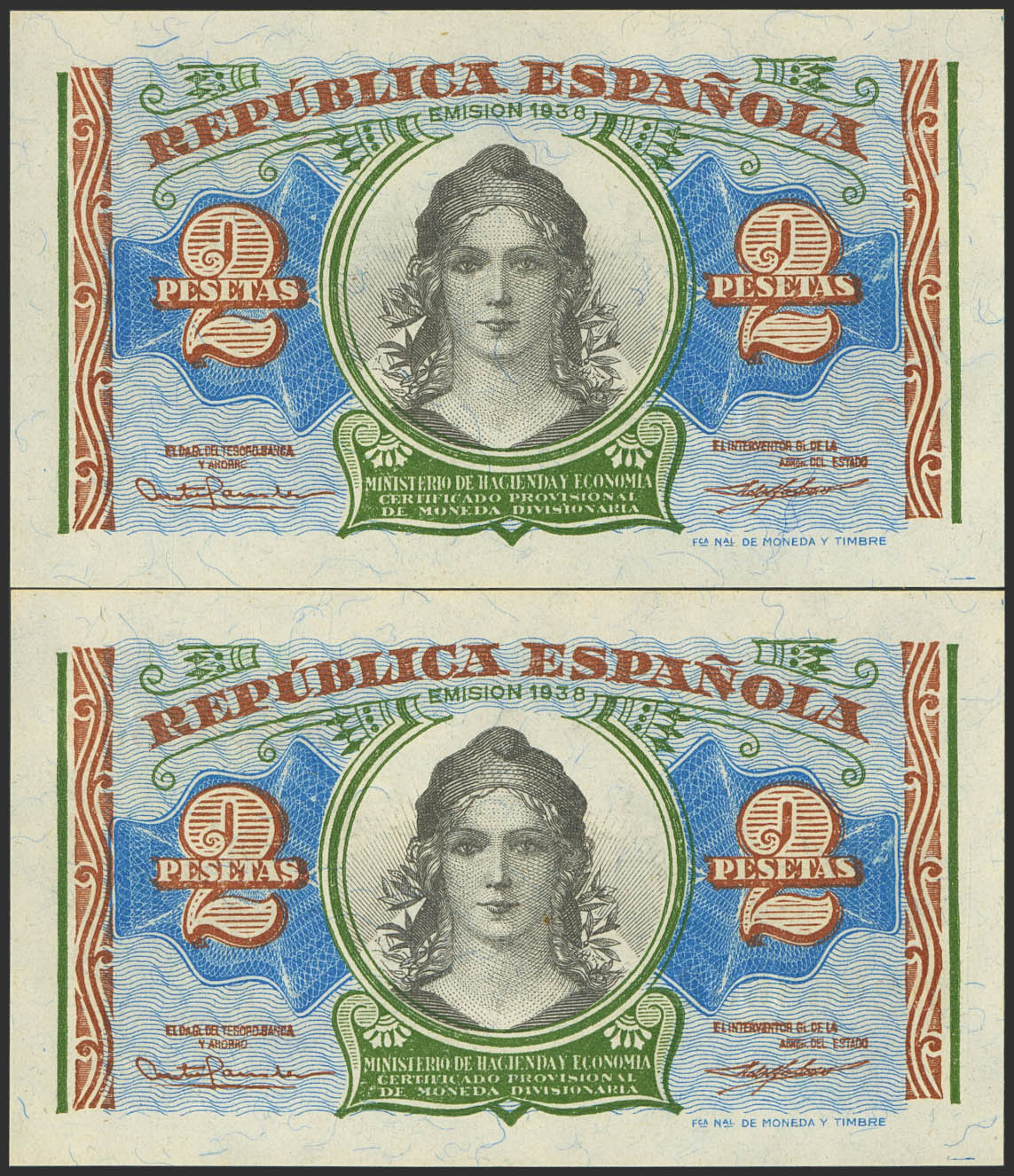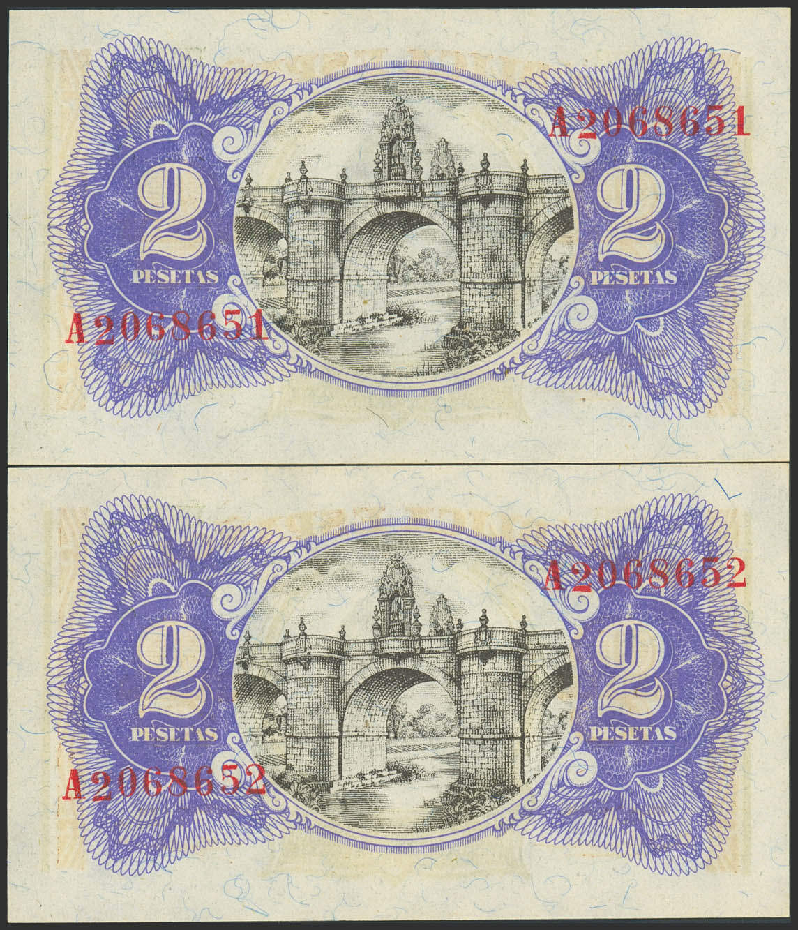 2 Pesetas. 1937. Ministerio de Hacienda. Pareja correlativa. Serie A. (Edifil 2021: 393). Apresto original. SC.