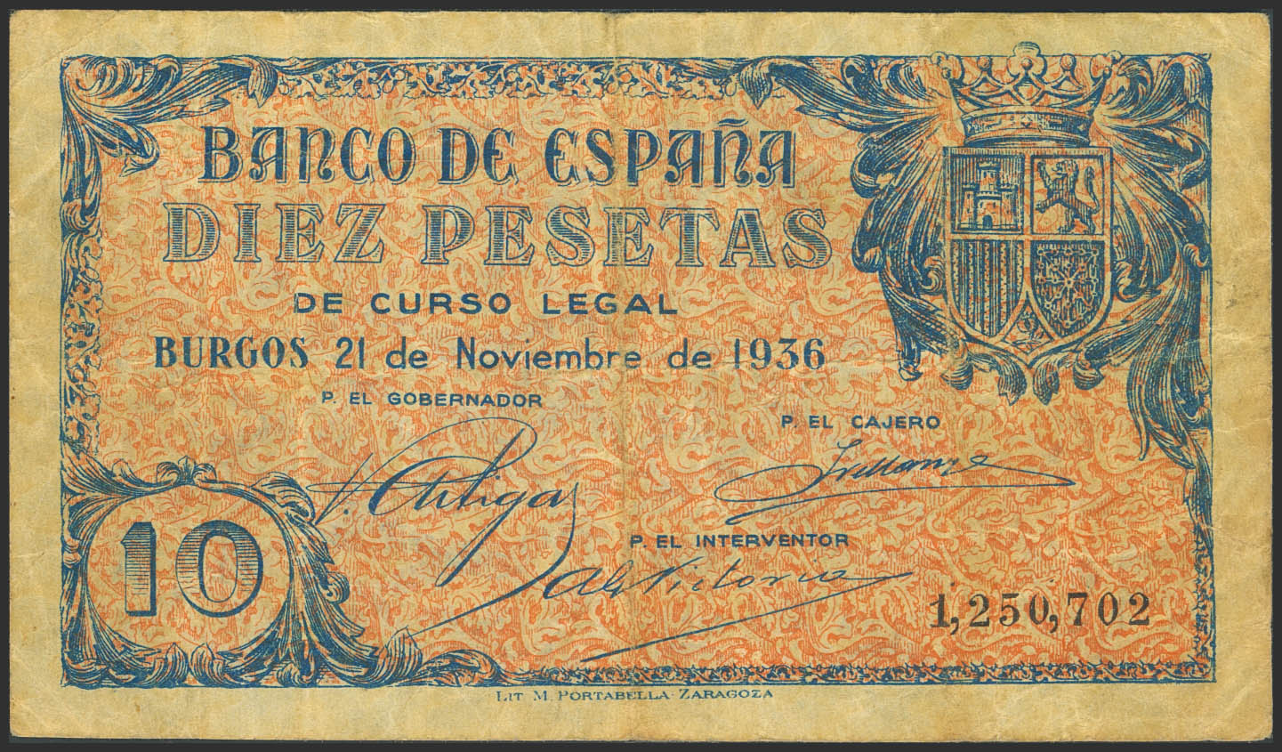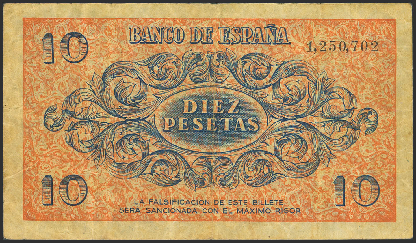 10 Pesetas. 21 de Noviembre de 1936. Sin serie. (Edifil 2023: 418). Inusual, sin reparaciones. MBC-.