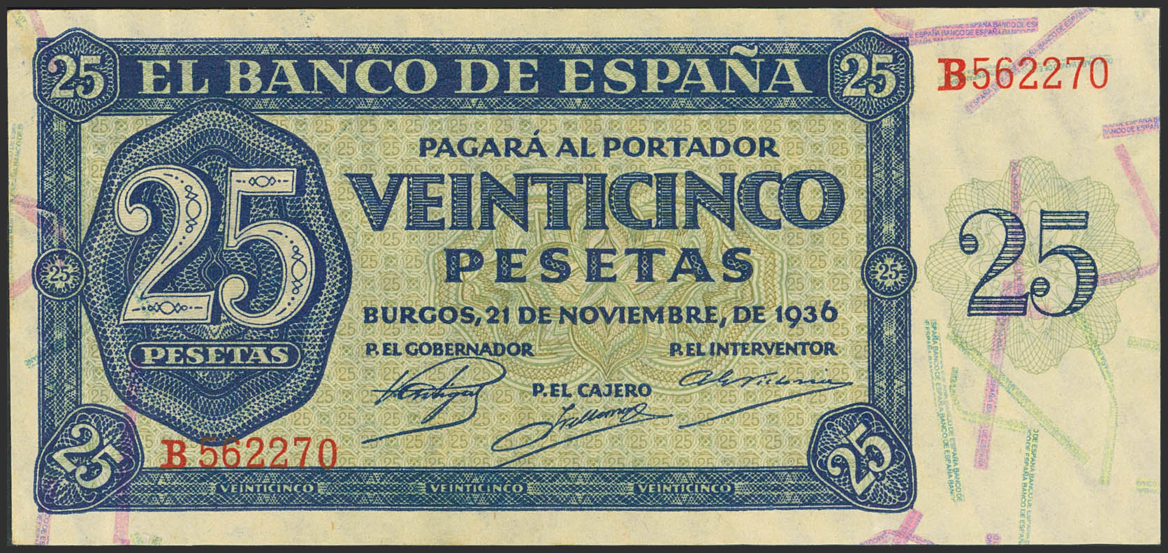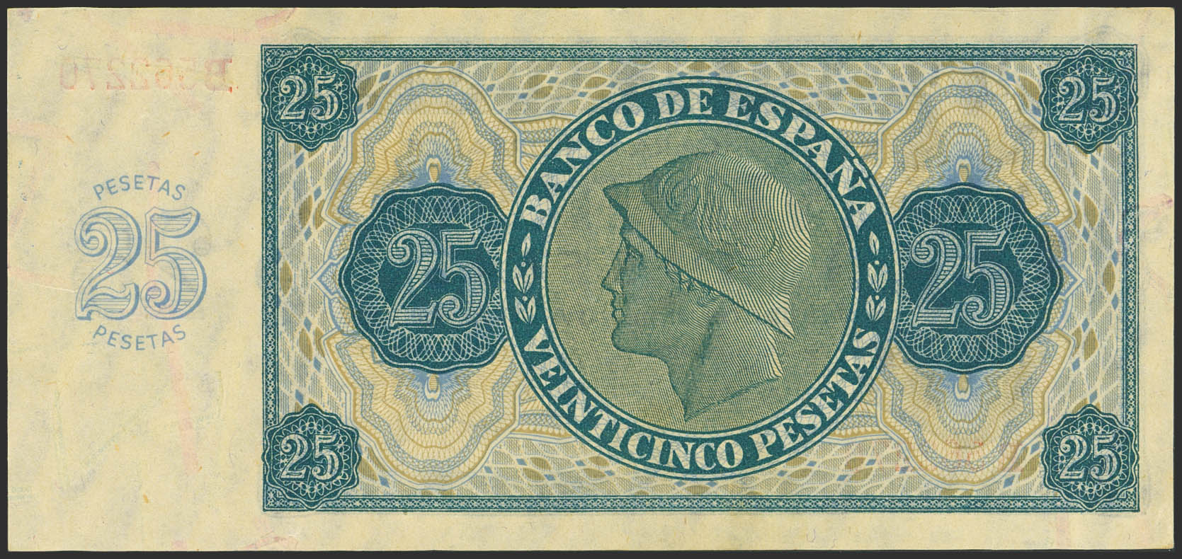 25 Pesetas. 21 de Noviembre de 1936. Serie B. (Edifil 2023: 419a). Conserva gran parte de su apresto original. EBC+.