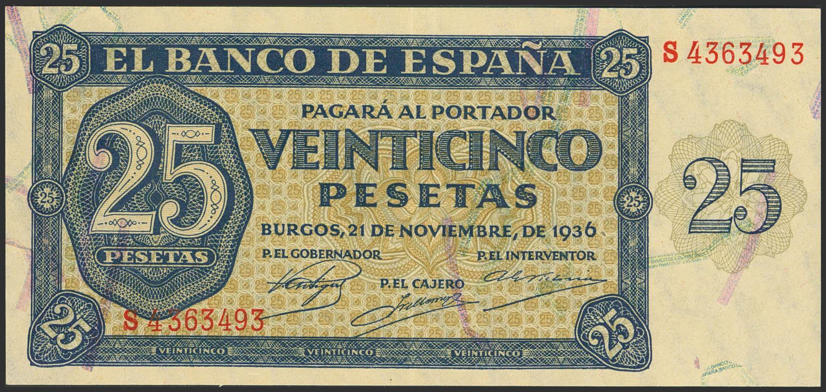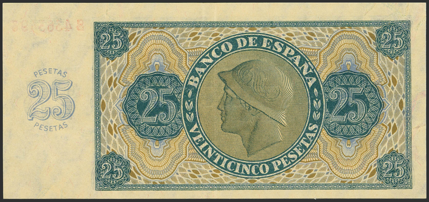 25 Pesetas. 21 de Noviembre de 1936. Serie S, última serie emitida. (Edifil 2023: 419b). Apresto original. EBC.