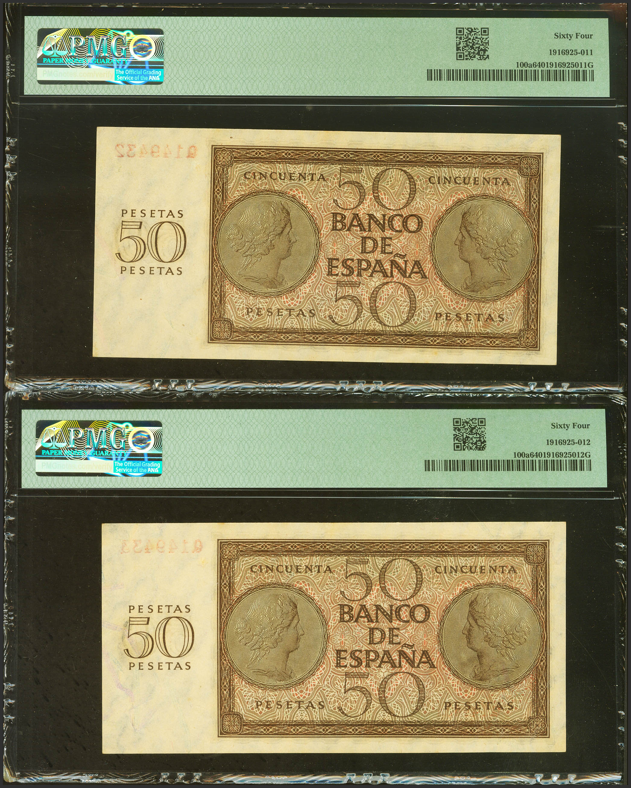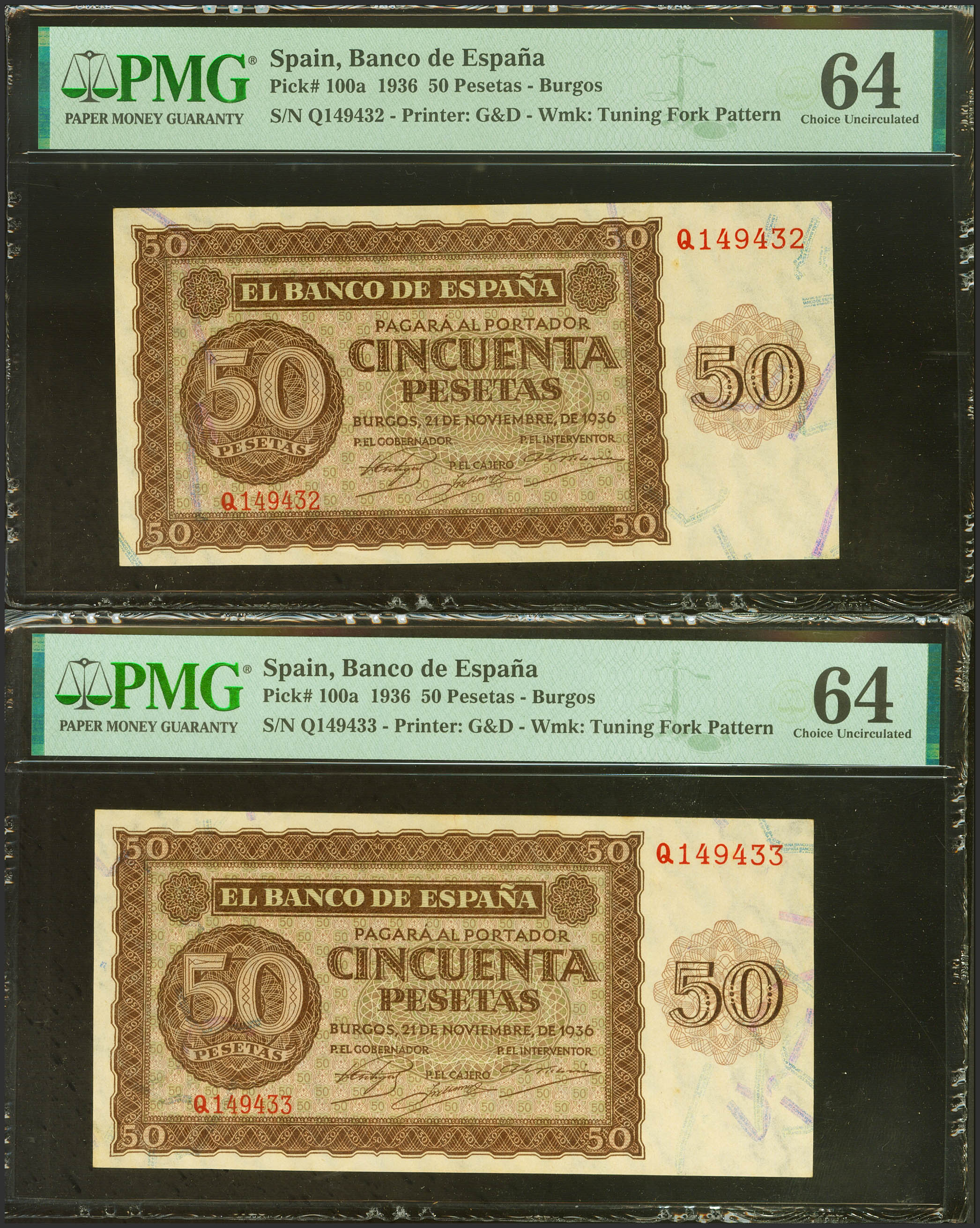 50 Pesetas. 21 de Noviembre de 1936. Pareja correlativa. Serie Q. (Edifil 2023: 420a, Pick: 100a). Rara en esta calidad. SC. Encapsulados PMG64, ambos.
