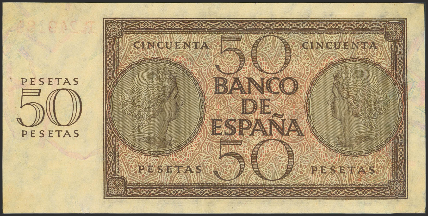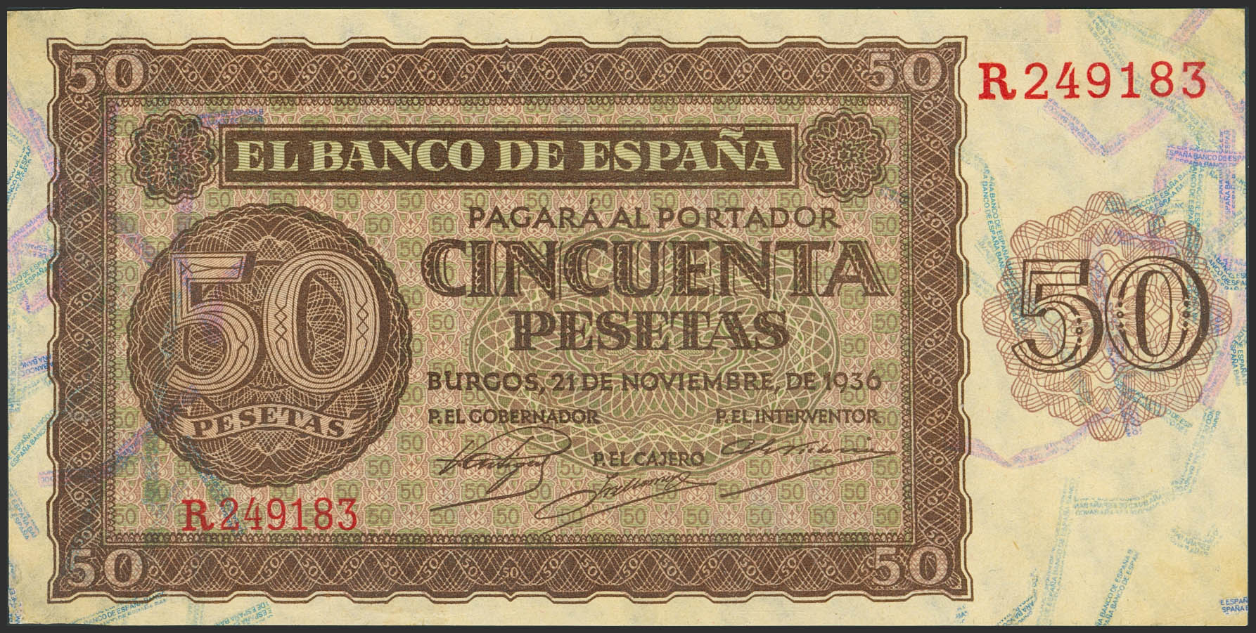 50 Pesetas. 21 de Noviembre de 1936. Serie R. (Edifil 2023: 420a). Conserva parte de su apresto original. EBC.