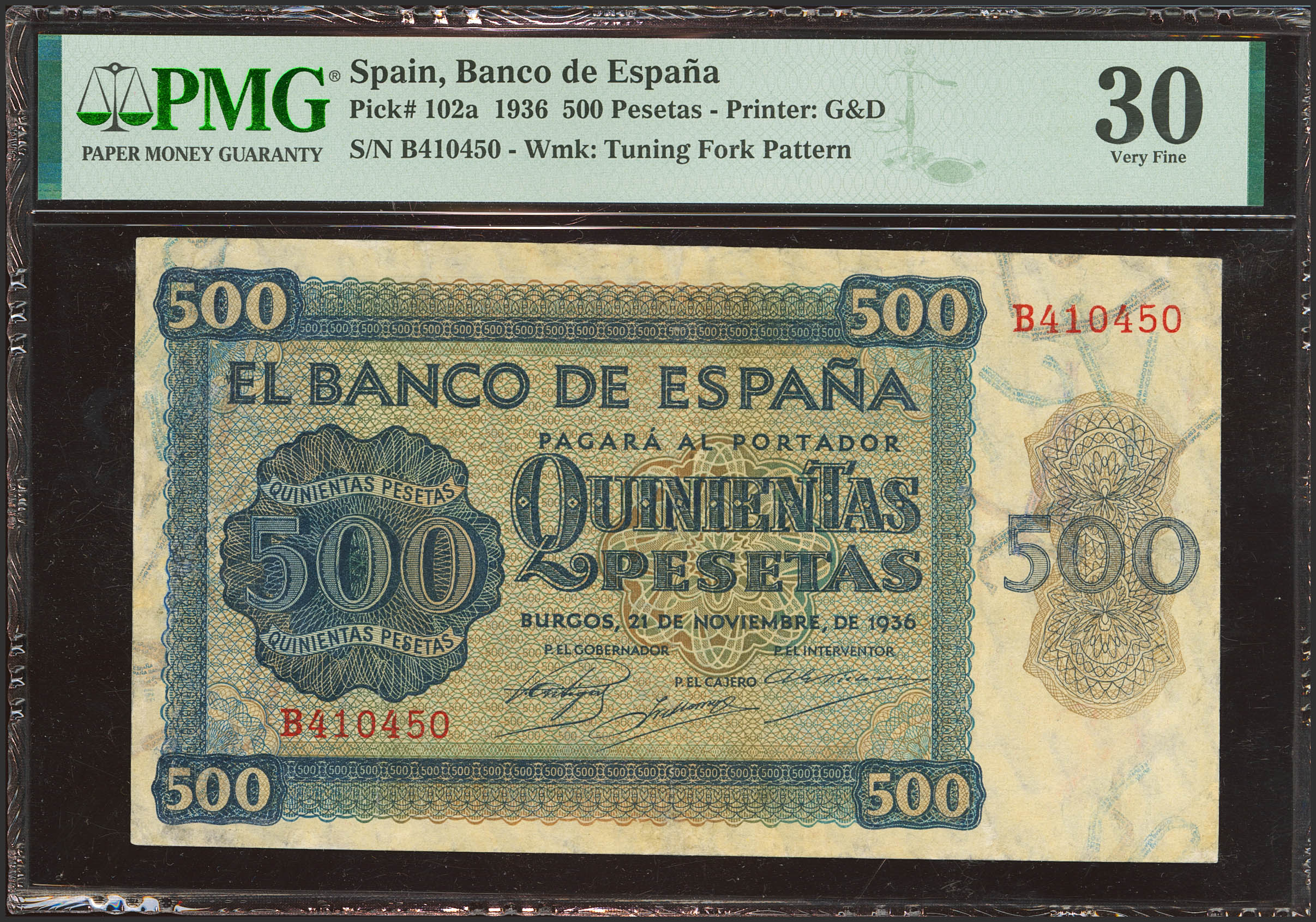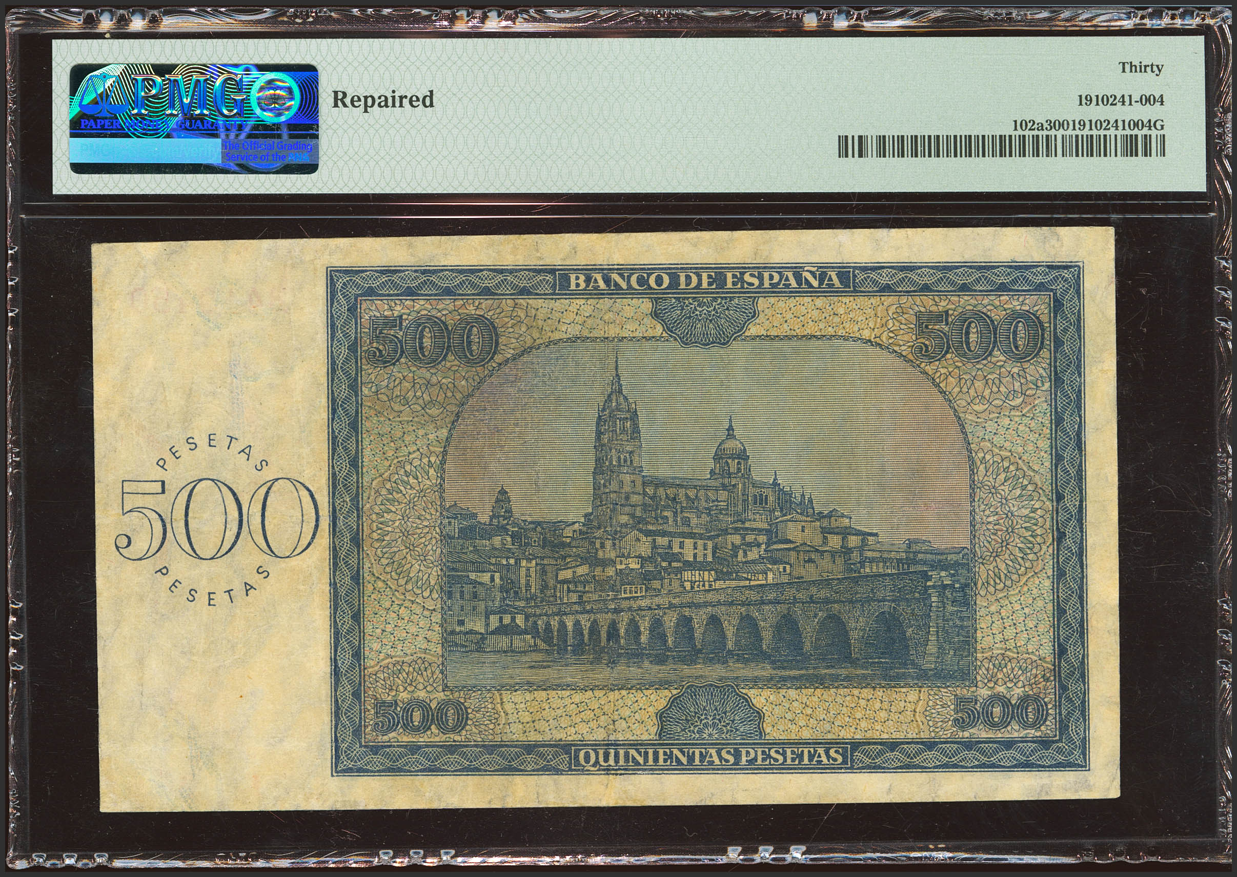 500 Pesetas. 24 de Noviembre de 1936. Serie B. (Edifil 2023: 422a, Pick: 102a). Reparado. MBC+. Encapsulado PMG30 (repaired).