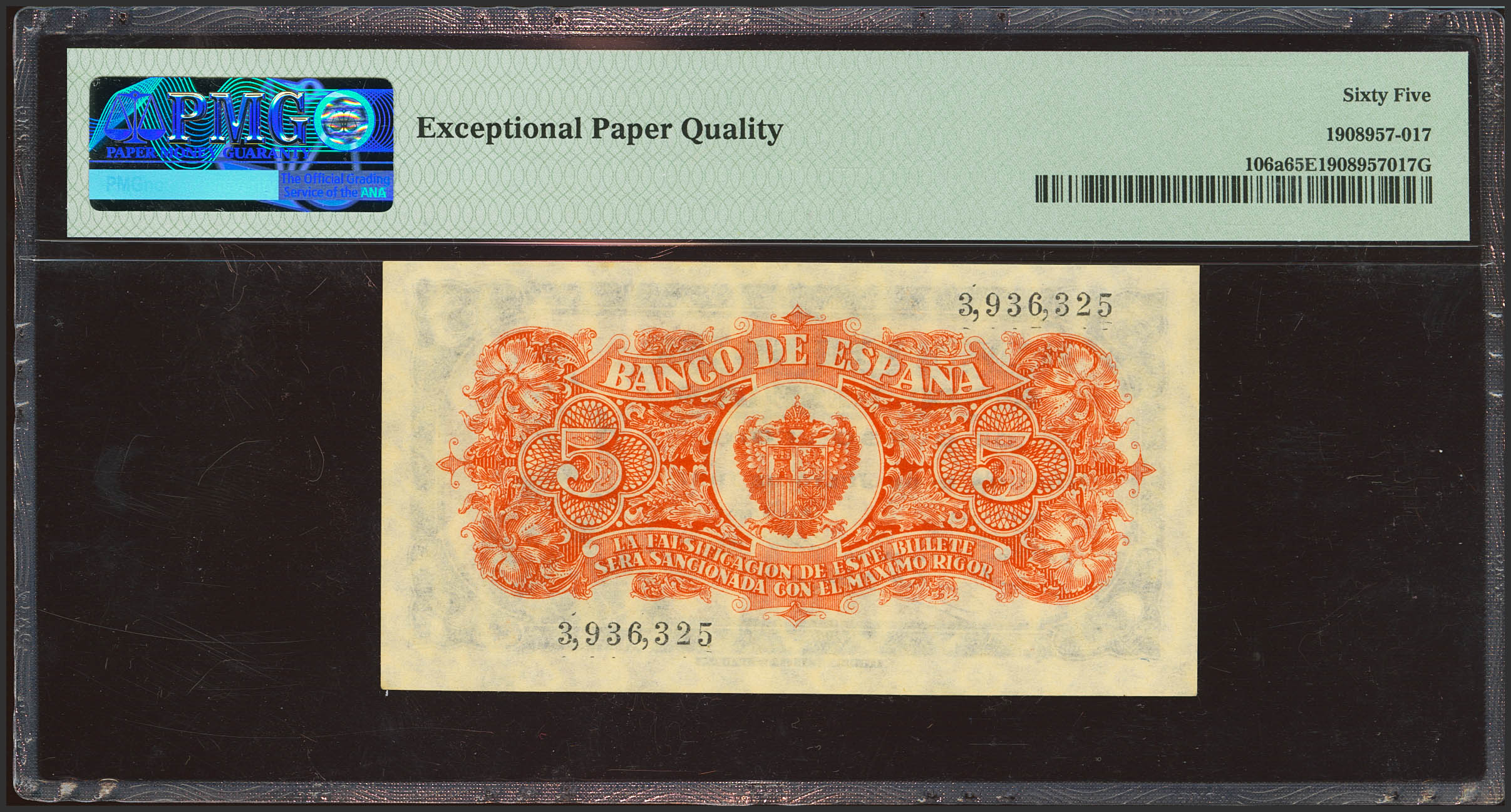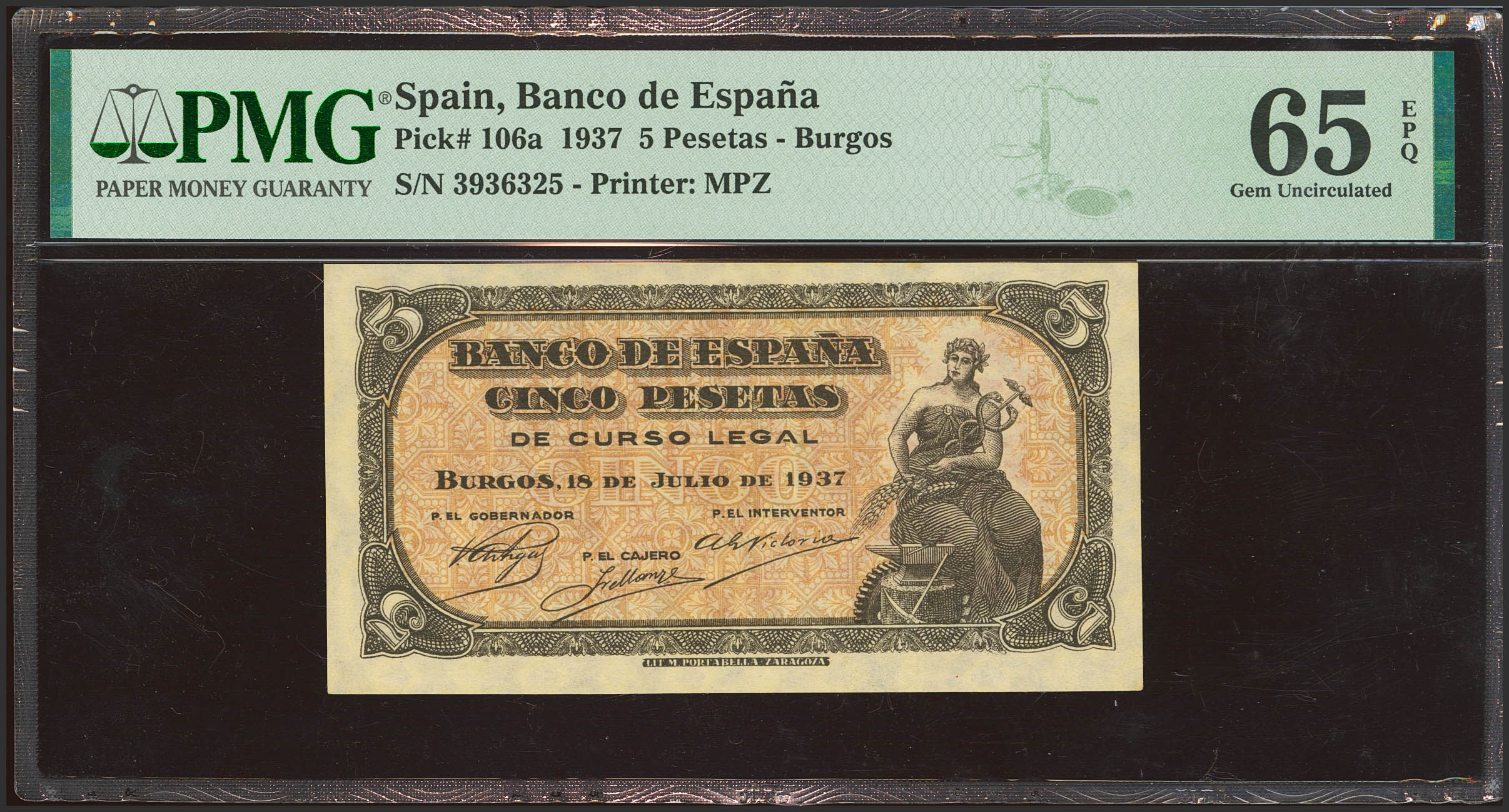 5 Pesetas. 18 de Julio de 1937. Sin serie. (Edifil 2023: 424, Pick: 106a). Apresto original. SC. Encapsulado PMG65EPQ.