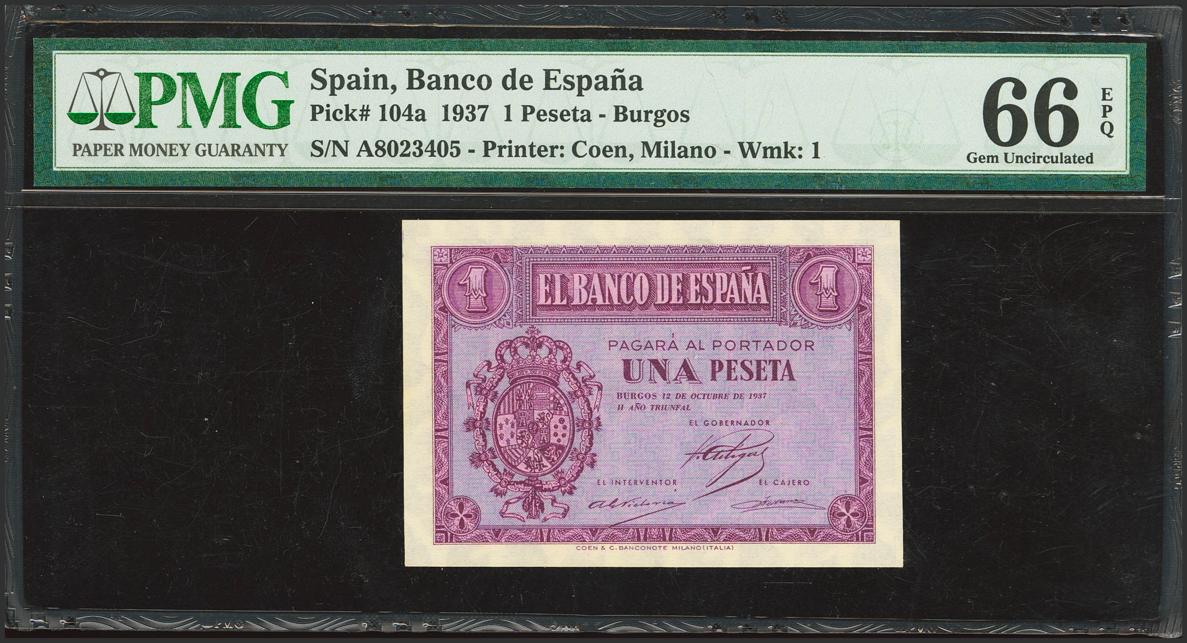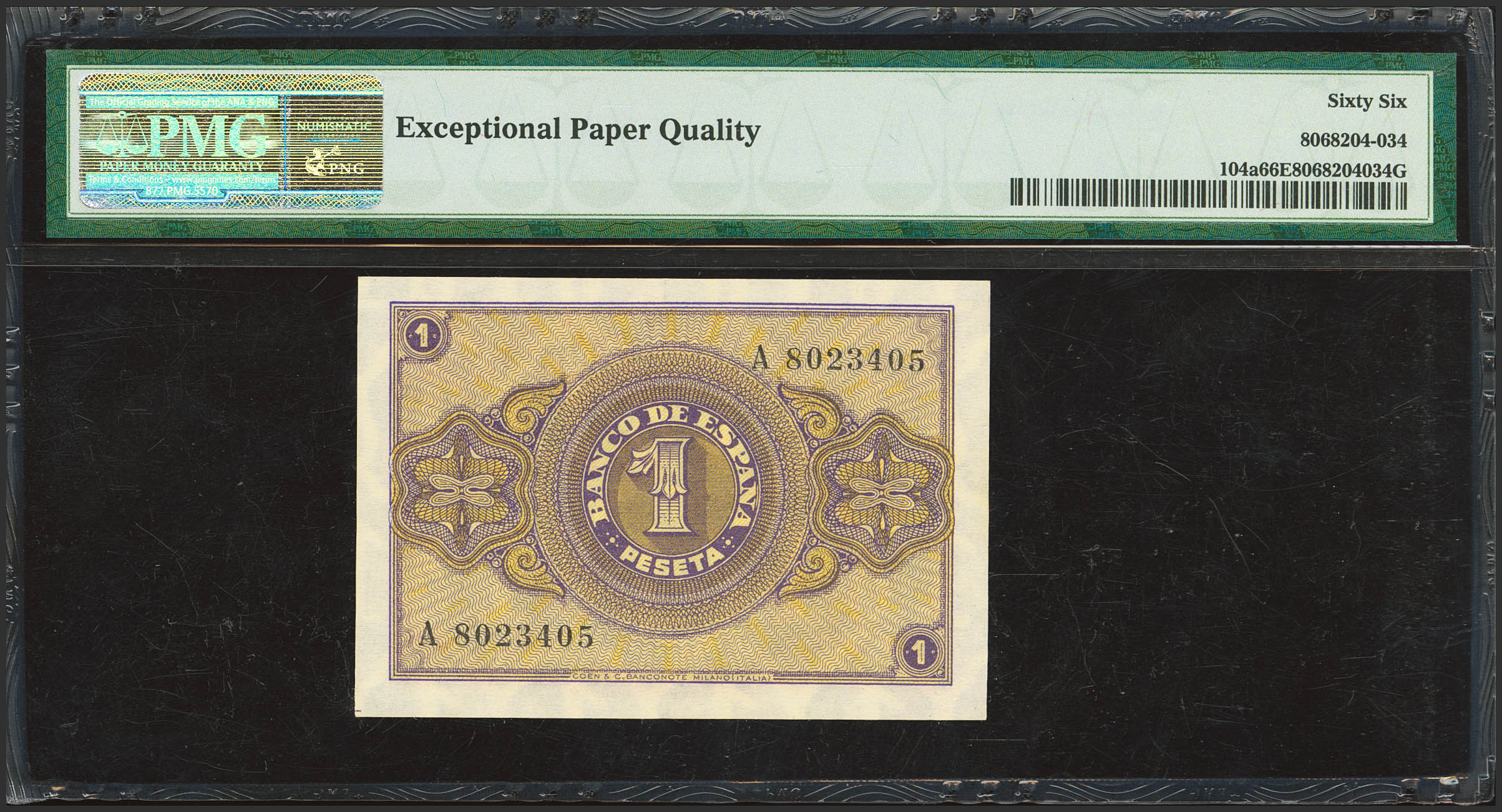1 Peseta. 12 de Octubre de 1937. Serie A. (Edifil 2023: 425, Pick: 104a). Raro en esta excepcional calidad, apresto original. SC. Encapsulado PMG66EPQ.