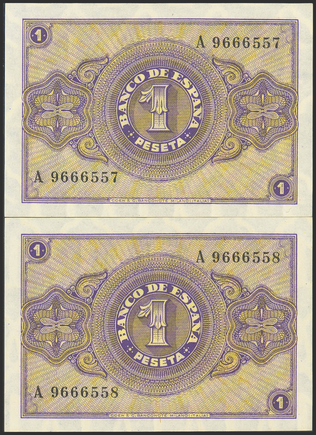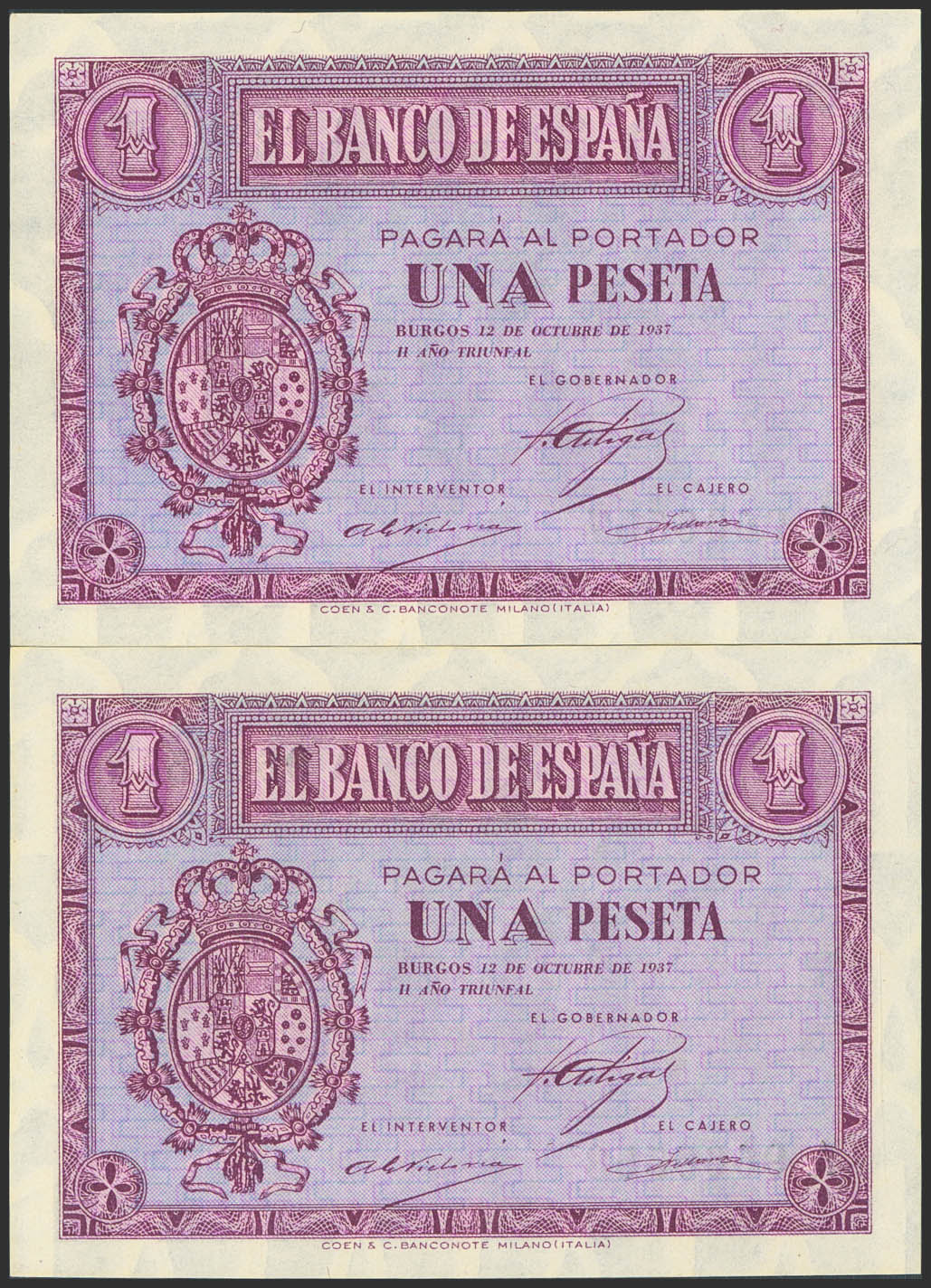 1 Peseta. 12 de Octubre de 1937. Pareja correlativa. Serie A. (Edifil 2023: 425). Rara en esta calidad, apresto original. SC.