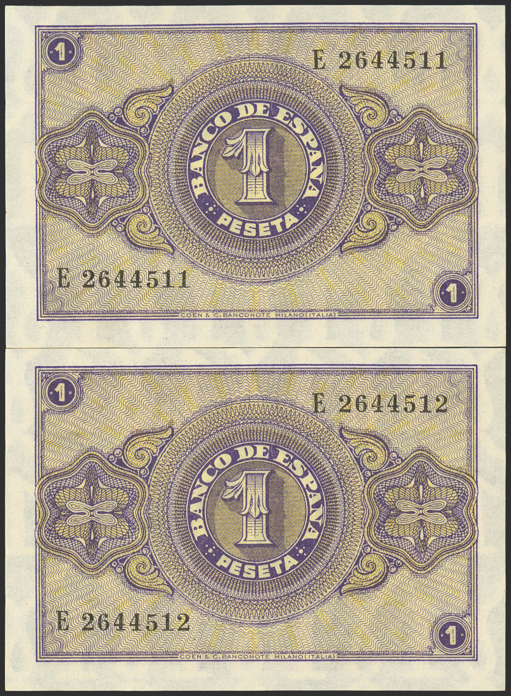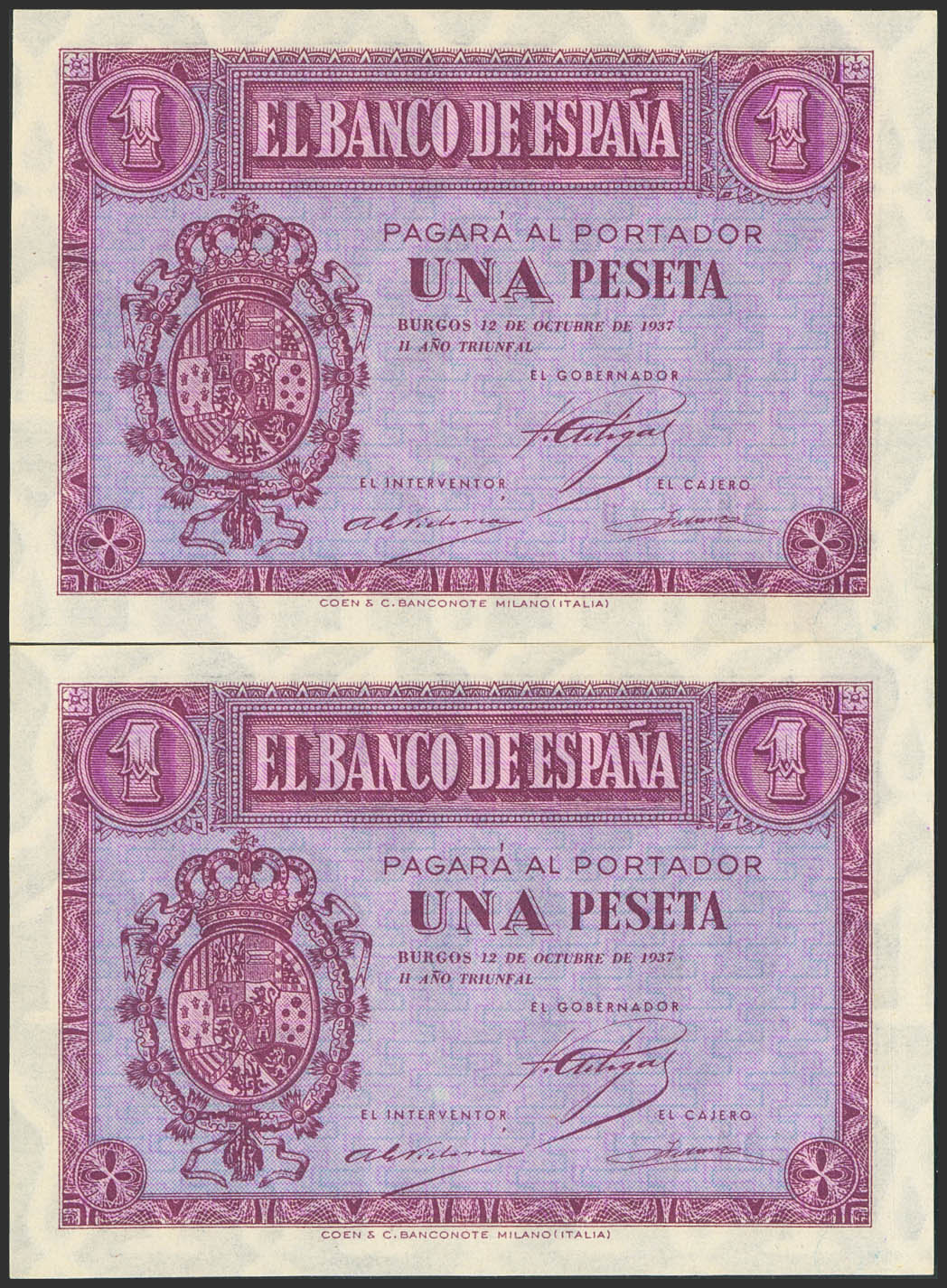 1 Peseta. 12 de Octubre de 1937. Pareja correlativa. Serie E. (Edifil 2023: 425a). Apresto original. SC.
