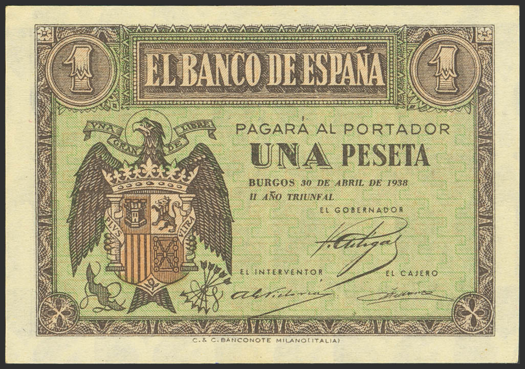 1 Peseta. 30 de Abril de 1938. Serie E. (Edifil 2023: 428a). Apresto original. SC.