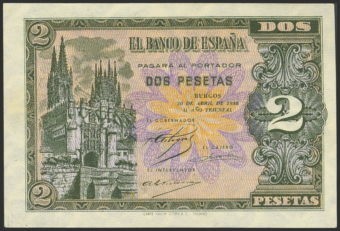 2 Pesetas. 30 de Abril de 1938. Serie F. (Edifil 2023: 429a). Apresto original. SC.