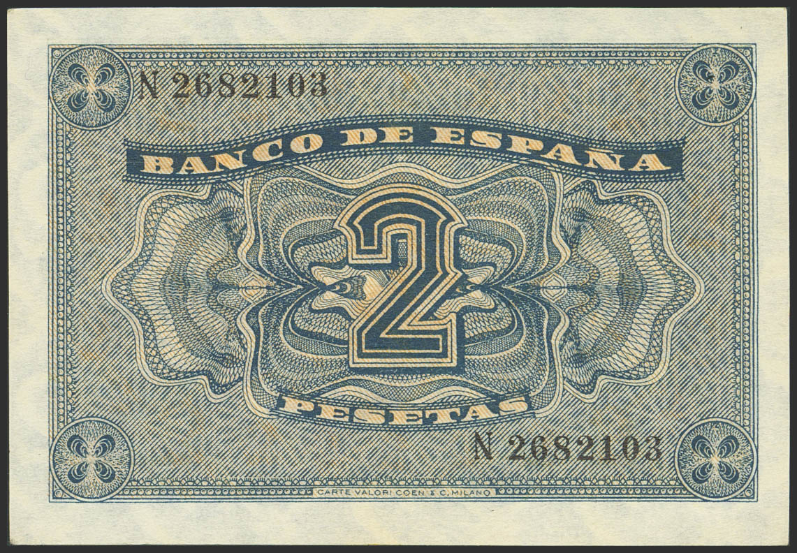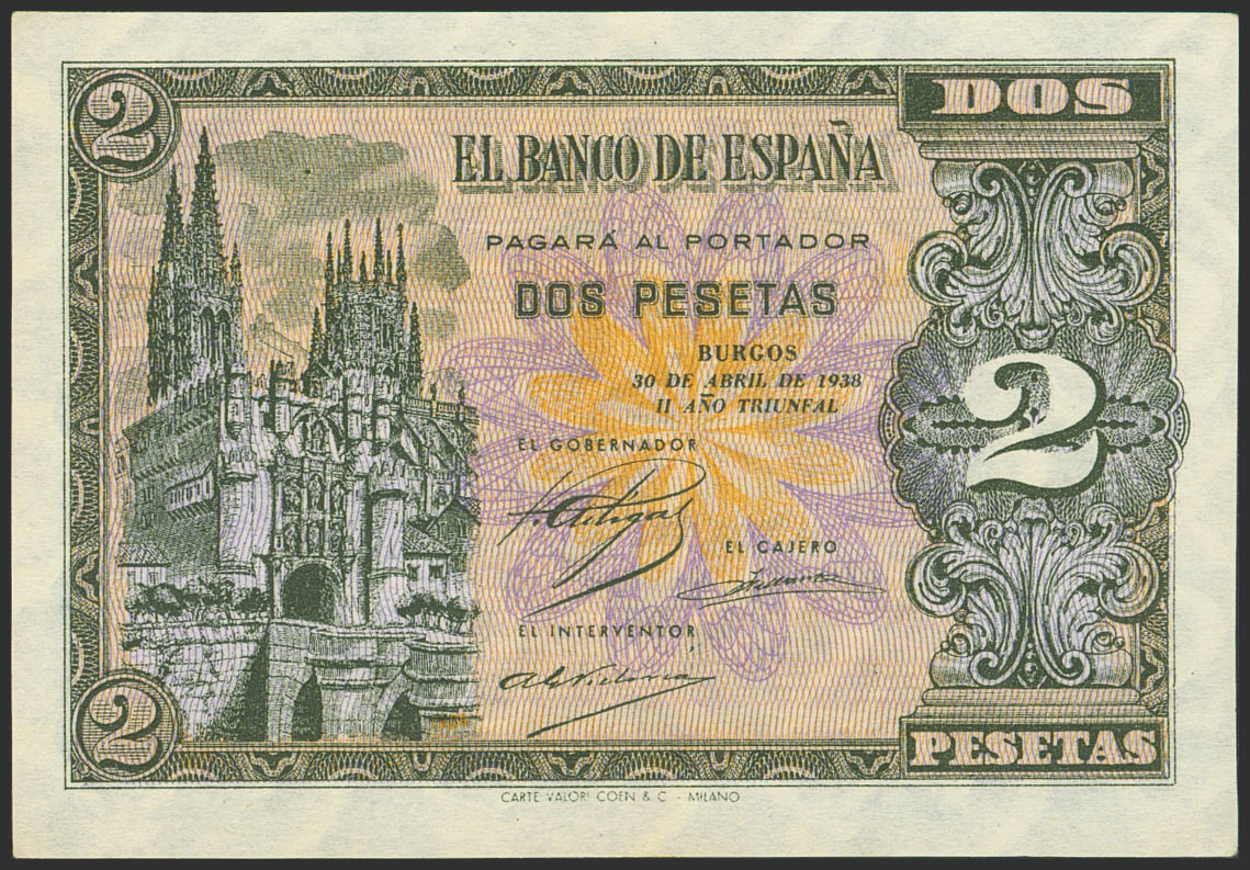 2 Pesetas. 30 de Abril de 1938. Serie N, última serie emitida. (Edifil 2023: 429b). Apresto original. SC.