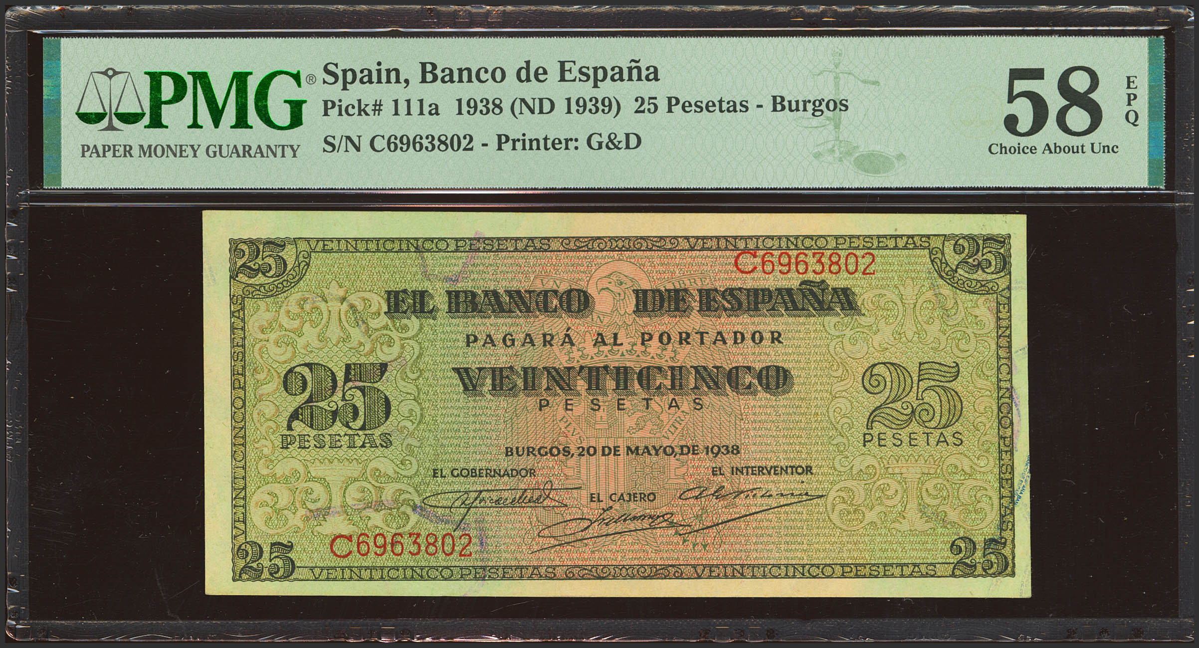 25 Pesetas. 20 de Mayo de 1938. Serie C. (Edifil 2023: 430a, Pick: 111a). Apresto original. EBC+++. Encapsulado PMG58EPQ.