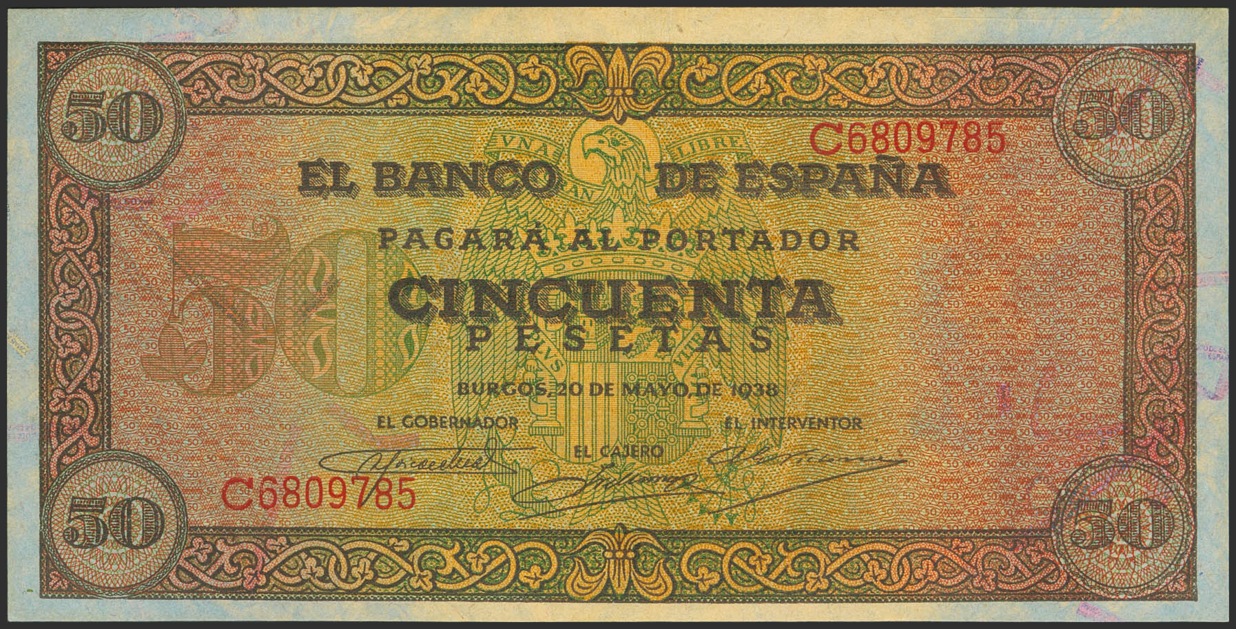 50 Pesetas. 20 de Mayo de 1938. Serie C. (Edifil 2023: 431a). Raro, apresto original. SC.