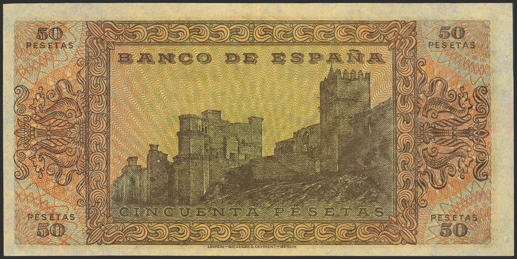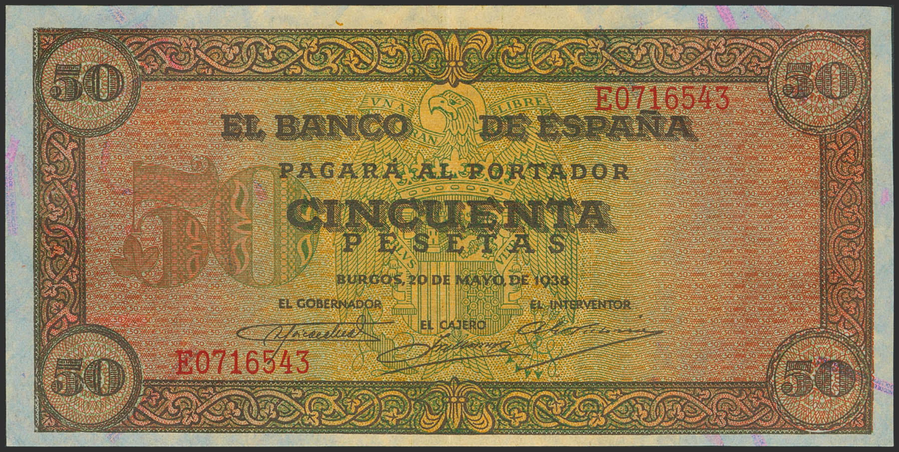 50 Pesetas. 20 de Mayo de 1938. Serie E. (Edifil 2023: 431a). Conserva gran parte de su apresto original. EBC+.