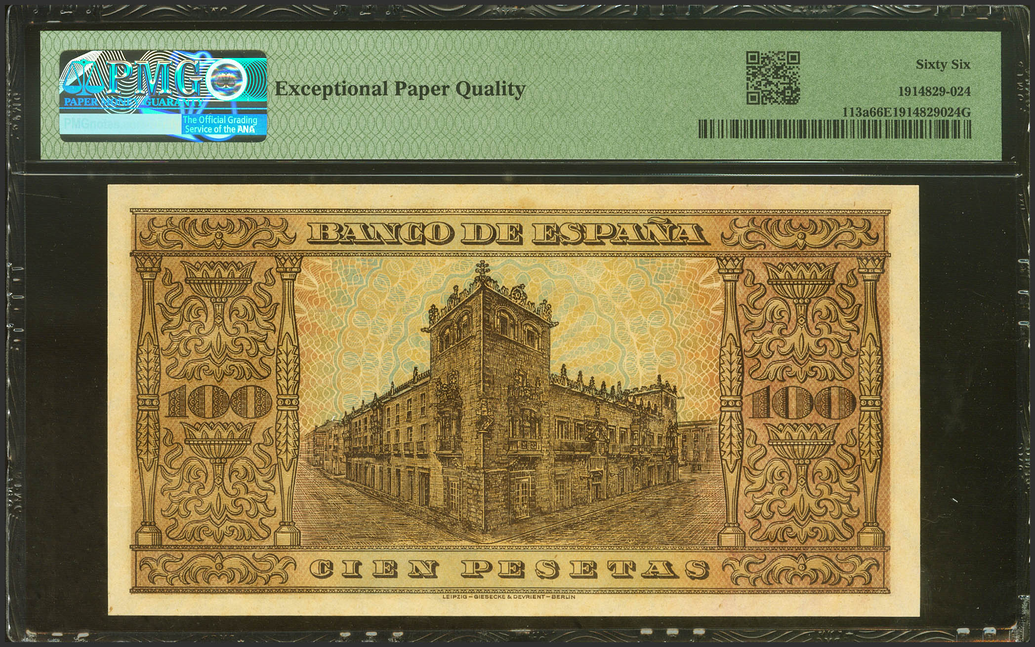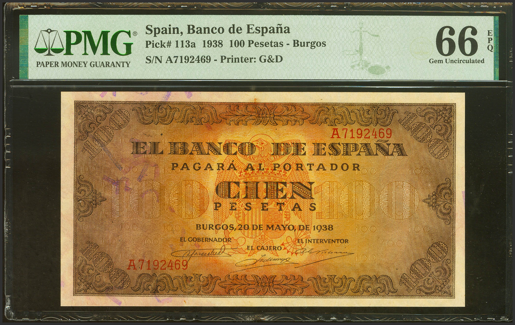 100 Pesetas. 20 de Mayo de 1938. Serie A. (Edifil 2021: 432, Pick: 113a). Muy raro en esta excepcional calidad, apresto original. SC. Encapsulado PMG66EPQ.